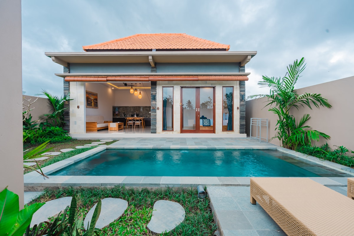 Luxurious private villa with 6x3 meter pool. Secure, private, safe. Lush garden and sheltered but open air kitchen for dining and relaxing by the pool. Queen bed, outside tub and shower, with fish pond view, fully equipped kitchen. AC, TV, great WiFi, daily cleaning and set breakfast is included. We are an 8 minute walk from the main road, or a short scooter ride. This means peace and quiet, and no car noise. Our staff will be happy to drive you in by scooter if needs be.