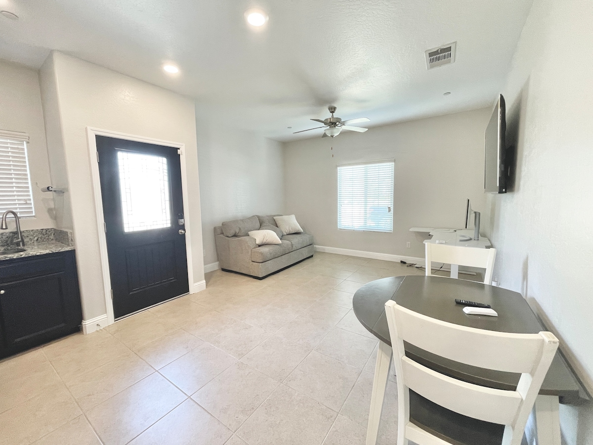 Stay at our modern guest suite in Visalia, just 40 minutes from Sequoia National Park entrance and blocks from downtown. Accommodates up to 3 guests—ideal for small families, couples, or solo travelers. Features a king-size bed, optional rollaway single bed (upon request) ideal for children or smaller adults, cozy living area, kitchenette, dedicated workspace with high-speed Wi-Fi, and walk-in shower. In a safe neighborhood near a scenic park with trails—perfect base for Sequoia adventures.