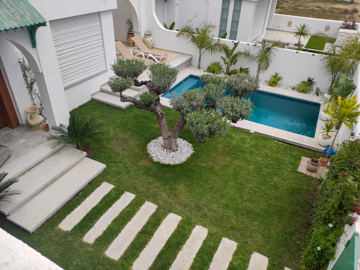 Villa in the calmest spot of Hammamet with a huge garden and big PRIVATE pool and patio. Equipped with a full list of amenities, stylish design and decor for a magnificent stay in the calm side of the mountain of Hammamet. Fire place in the living room and a fire pit in the garden for a warm moment with family and friends. Located in between Only 5 minutes drive to downtown and the beach and 5 minutes to the highway leading to Tunis and Nefidha Airport. A Padel tennis court is just few steps.