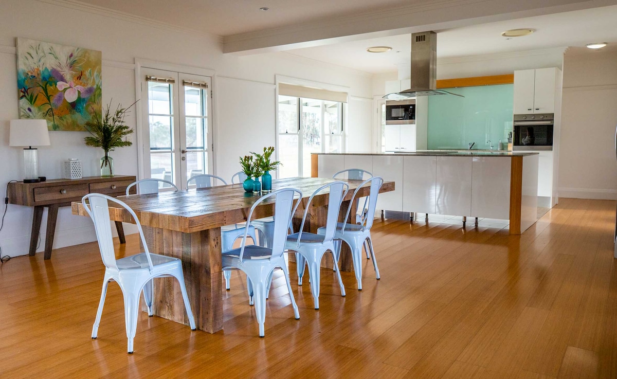 Abercorn is an elegant, architect-designed country house set on a lovely farm, surrounded by Mudgee's famous vineyards and only 7 minutes from Mudgee CBD. Spacious, stylish, with light-filled interiors and views from every window of the farm, vineyards and countryside. Personal recommendations for Mudgee provided after you book, and a complimentary bottle of beautiful local wine on arrival. Abercorn is a Holiday Home of the Year for 2025. Not available for parties or weddings.