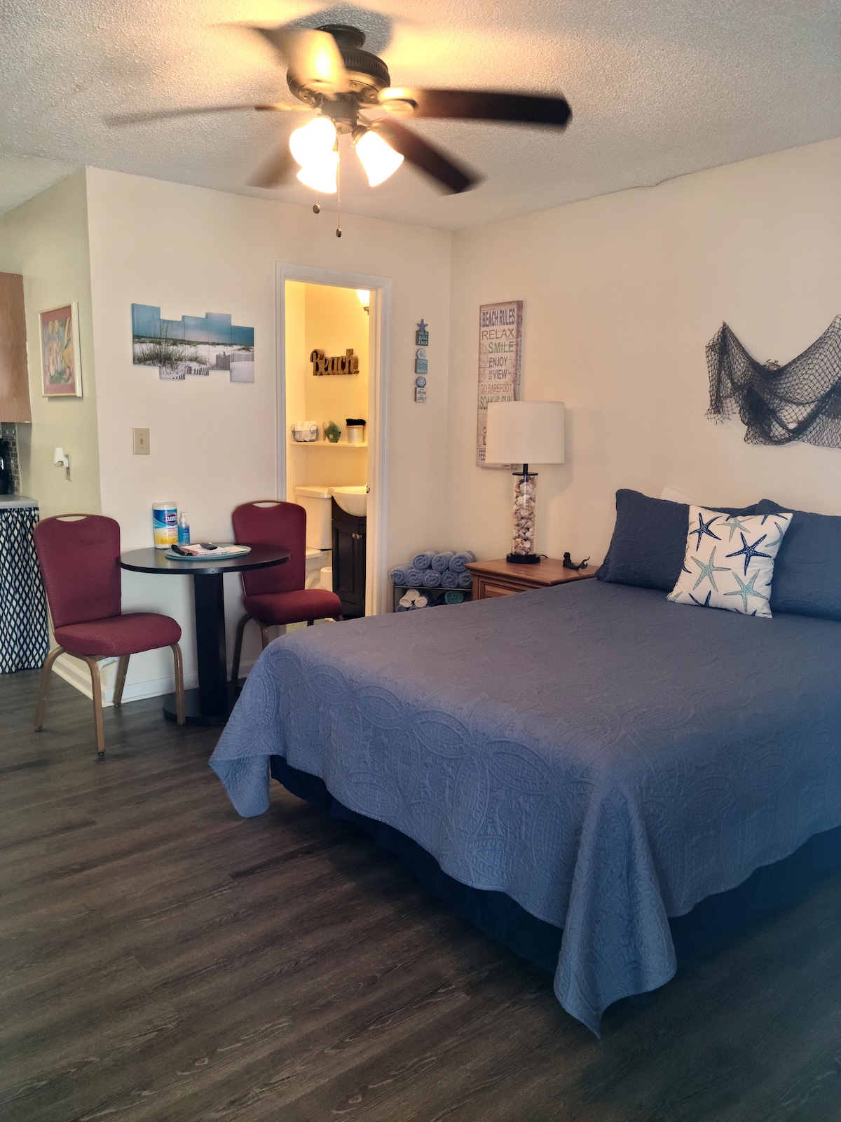 LOCATION, LOCATION, LOCATION This efficiency studio apartment is just right for two people. It is on the 2nd floor. for your comfort the apartment has a new Queen size bed, private entrance, stocked kitchen, and private bathroom. There is a large shared covered deck, great for relaxing and chatting with other guests. All units have wifi and 50 inch ROKU tvs. Bring your log ins! WE ARE IN A COMMERCIAL AREA WITH BARS, restaurants, ect...IT DOES GET LOUD ON WEEKENDS and during peak season..