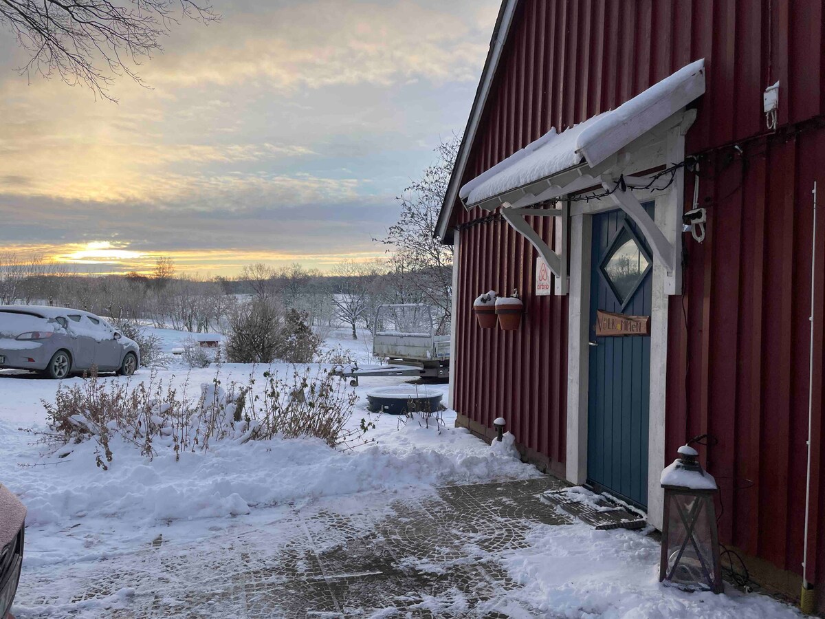 Live in a selfhouseholdning farm with animals near by you. The bedroom has 2 beds, one bed chair and wardrobe. Here are lots of animals - cows, pigs, goats (on pasture a bit away right now), chicken, dog and cats. Nice sorroundings with walking trails like Skåneleden and lakes near by (the nearest lake is 5 km away). Lots of parkingspace on the ground. Its 2 km to the village with convenience store and gas station and train.