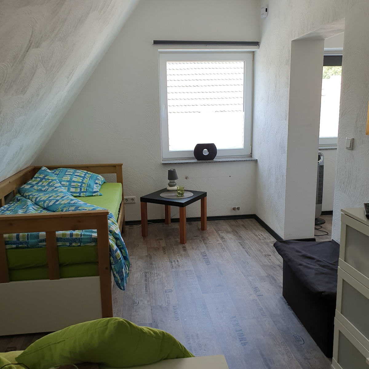 The apartment is located on the 1st floor and is accessible via an external staircase. There is also a small terrace that can be used. The interior walls are plastered with clay plaster, the floor is laid with plank boards. The apartment is located in a quiet side street. Public transport (bus and train) is very close. A regular connection to Aachen, Herzogenrath or the Netherlands can be reached in a 10-15 minute walk.