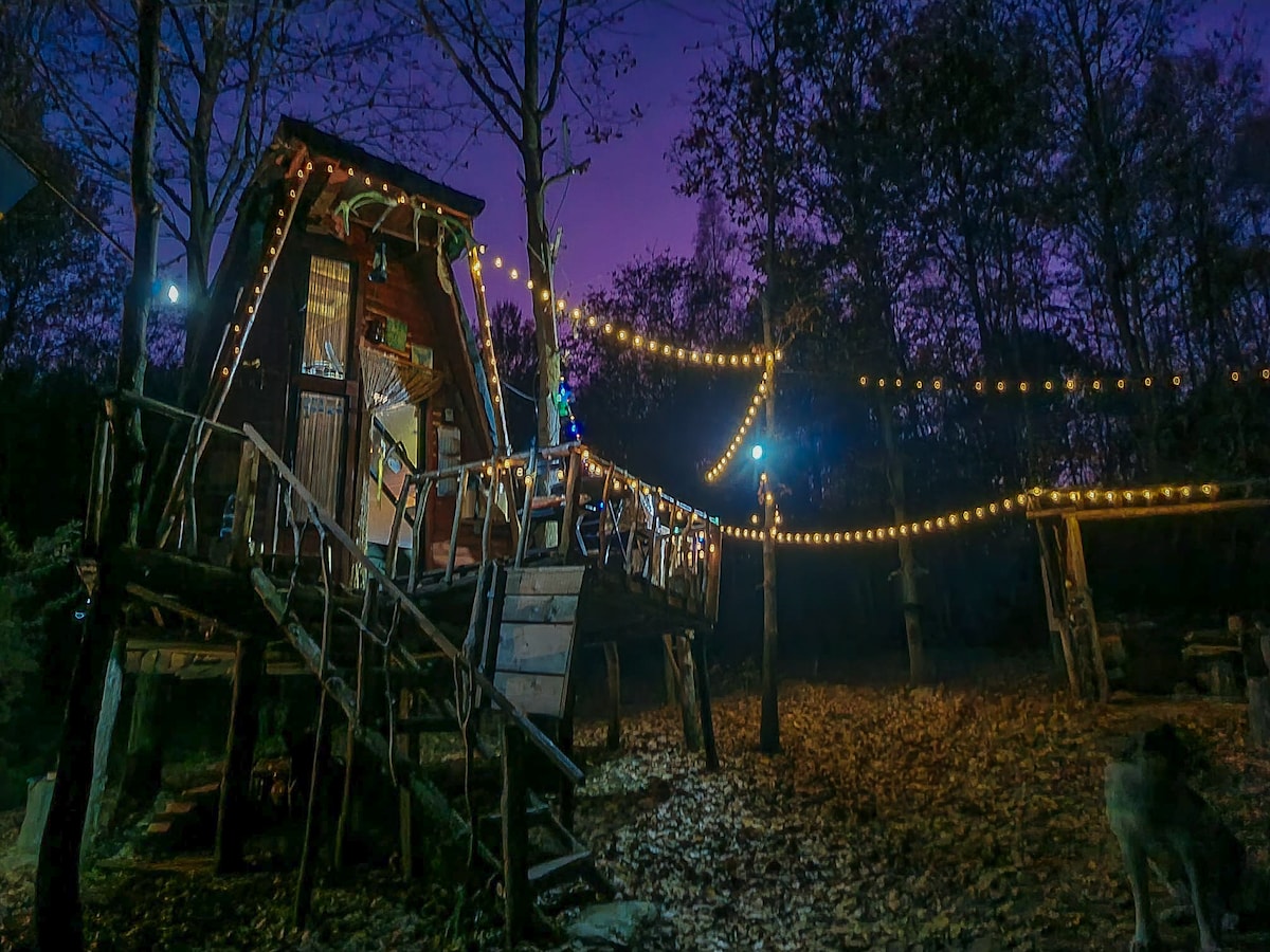 The tree house is located 1 km from our town, the road being on an 800 m unpaved section but accessible by any car! #The house is off-grid, we compensate with a solar panel and an Eco-flow system the need for light, charging gadgets, and having a built-in 220v DC socket.