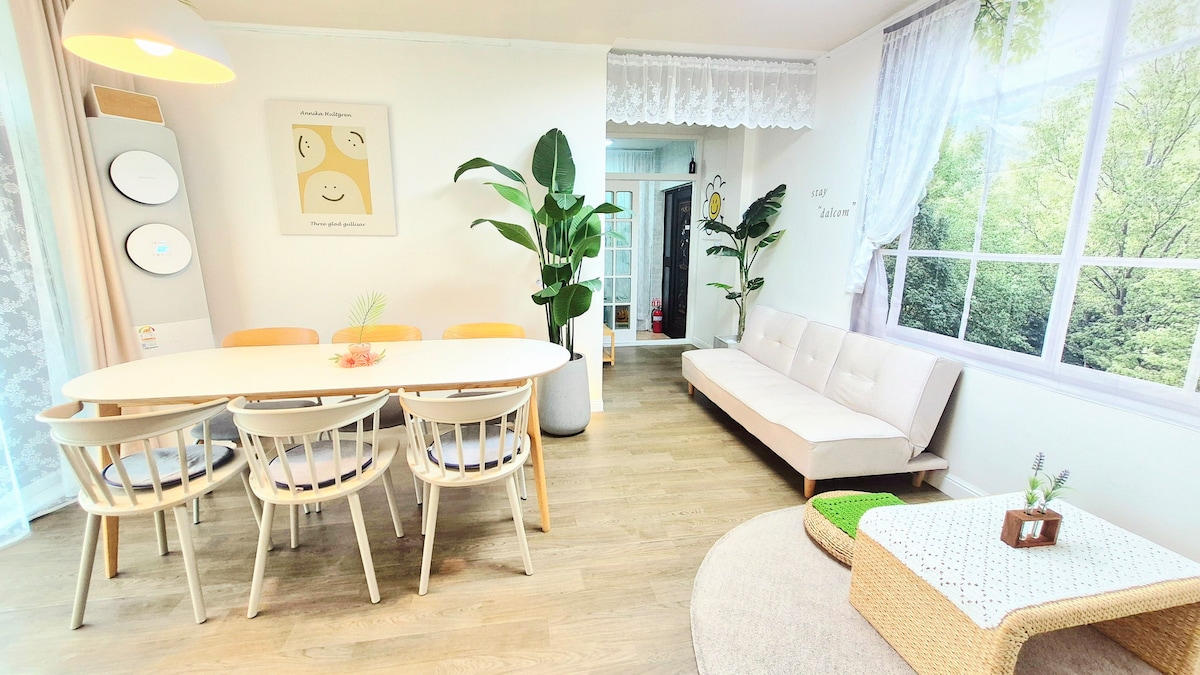 This is Ulsan accommodation stay "Sweet". stay "dalcom" is a pleasant and warm space with a wood white interior, a spacious and cozy place to stay with family/friends/lovers, and is located on the 2nd floor of the stairs without an elevator that can park 4 cars in the building. 2 bedrooms (air conditioning in each room), 1 large king bed, 2 queen beds, 2 sofa beds, 1 bathroom, and can accommodate up to 8 people. Netflix. (For 2-person reservations, the room is a large king (180x210) bed room) Location * 5 minutes by car from Ulsan IC * 1-minute walk from the promenade of the Taewa River National Garden * 7 minutes by car from Ulsan University * 9 minutes by car from Ulsan Innovation City * Sipri Forest Food Complex (130 restaurants) 5 minutes by car * 2-5 minutes on foot from the bus stop * Mart, convenience store 3 minutes on foot *Gunggeorang Park (Ulsan Cherry Blossom Spot) 5 minutes by car * 3 minutes by car from Taehwa River Observatory * Taehwa River Cave Pia 4 minutes by car *Migratory Bird Promotion Center, Wawa Park Playground, Jeonggwangsa Temple 7 minutes on foot * Gangdong Mongdol Beach, Ilsanji Sea, Daewangam Park Jangsangpo Whale Culture Village, Museum, Ulsan Rock Art Museum About 30 minutes by car * Check-in time: 16:00 * Check-out time: 11:00