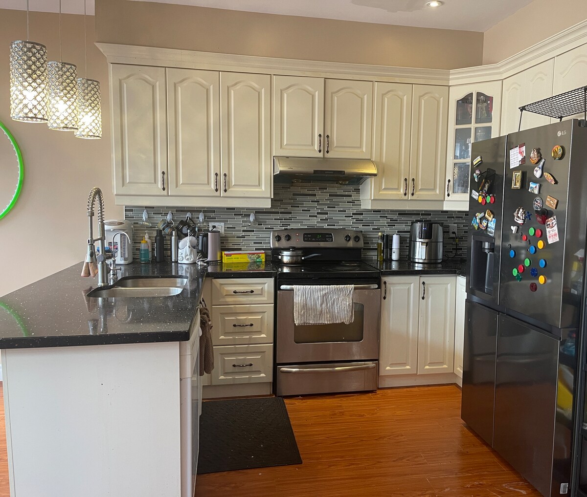 3 Bedroom. 2 Queen Beds 2 Single Beds. Your family will be close to everything when you stay at this centrally located home. 5 minute walk to Trillium hospital. 5 minute walk to all amenities. 2 minute walk to Major bus line. 3km to square one. Completely renovated first floor. Brand new kitchen, appliances, bathroom, hardwood floor, all electrical lighting, freshly painted, for you to experience. Free parking up to two cars, shared laundry, shared large backyard with patio and barbecue.