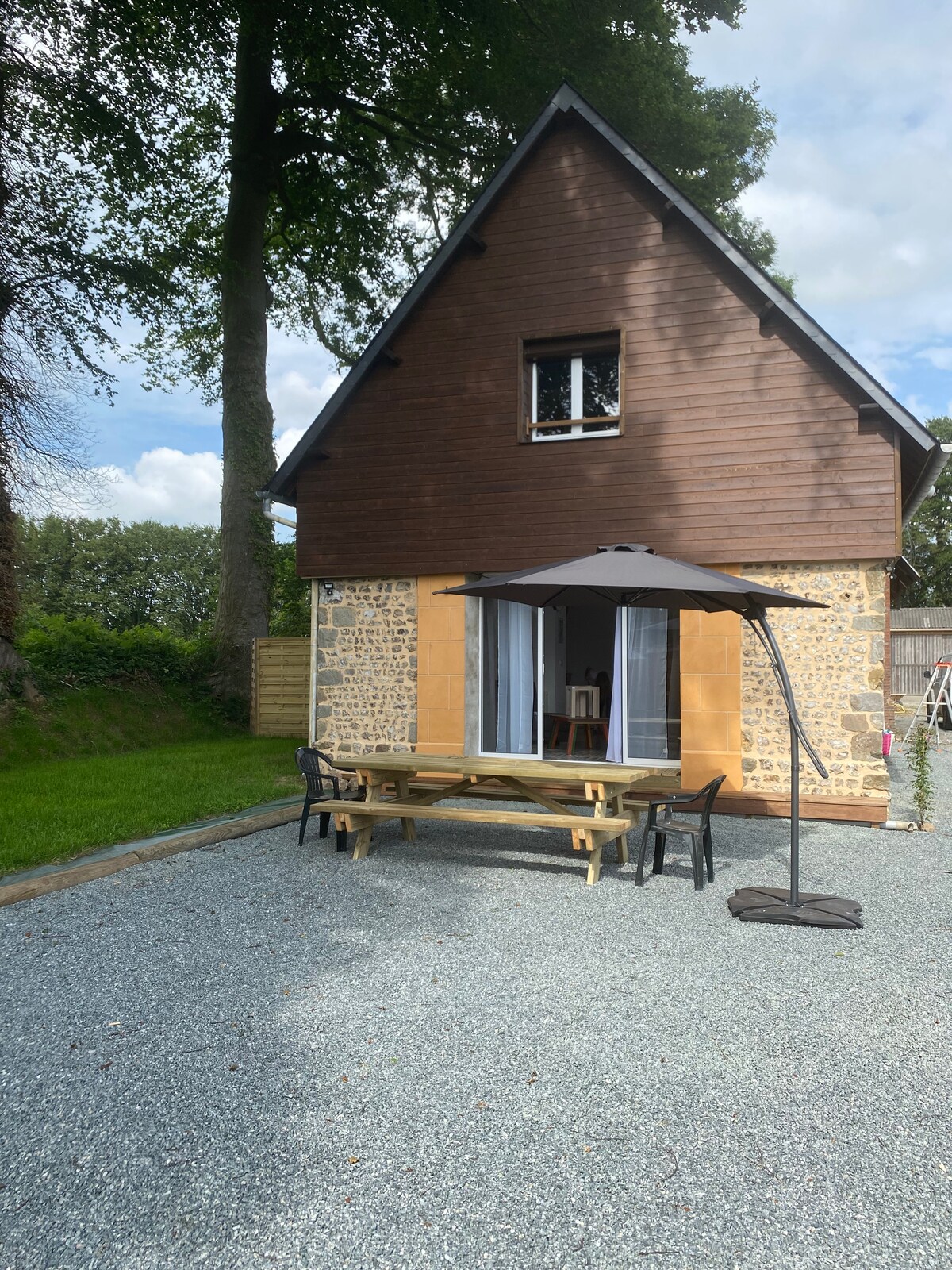 5 km from an exit on the A 29, "Les Mésanges" is a real half-timbered Norman house, recovered from a barn from the beginning of the last century. This vast house is in the heart of a wooded park where horses come to graze in the summer The cottage has a large 36 m2 private space with: a 16 m2 bedroom, a 9 m2 bathroom (walk-in shower), a separate toilet, a small equipped kitchen with dining area overlooking an entrance with direct access to your south-facing terrace.