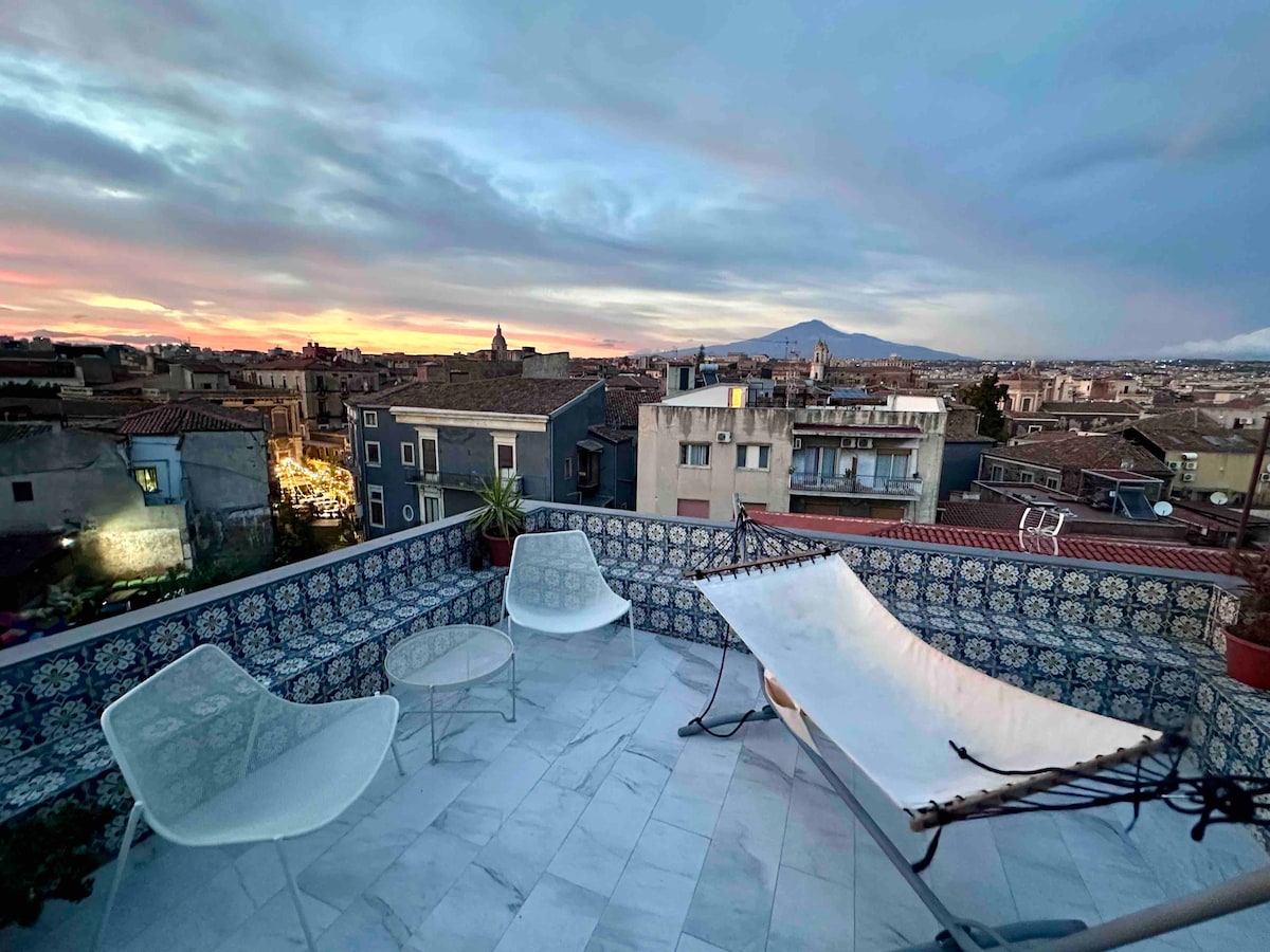 Enjoy unique views of Ursino Castle, Etna volcano, cathedral dome and sea from the panoramic terrace of my trendy loft apartment. The curated interior ambience is light, bright and features a mezzanine bedroom overlooking the living area. Just 150mt far from the typical and colourful fish market, 300mt from the Duomo square and 2km from the beach.