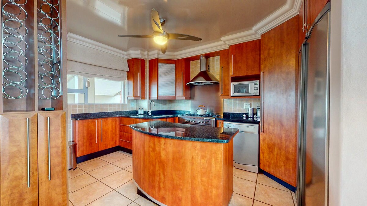This spacious Penthouse with incredible 180 degrees sea views from its spacious covered patio is perfect for sipping sundowners and preparing meals on the gas braai. The apartment is only a short 5 minute walk to the very popular blue flag Lucien beach as well as convenient shops and restaurants. The unit comes with a fully fitted kitchen, 2 bathrooms and 3 bedrooms. The large outdoor entertainment patio is furnished with loungers and a family dining area. All 3 bedrooms are air-conditioned.