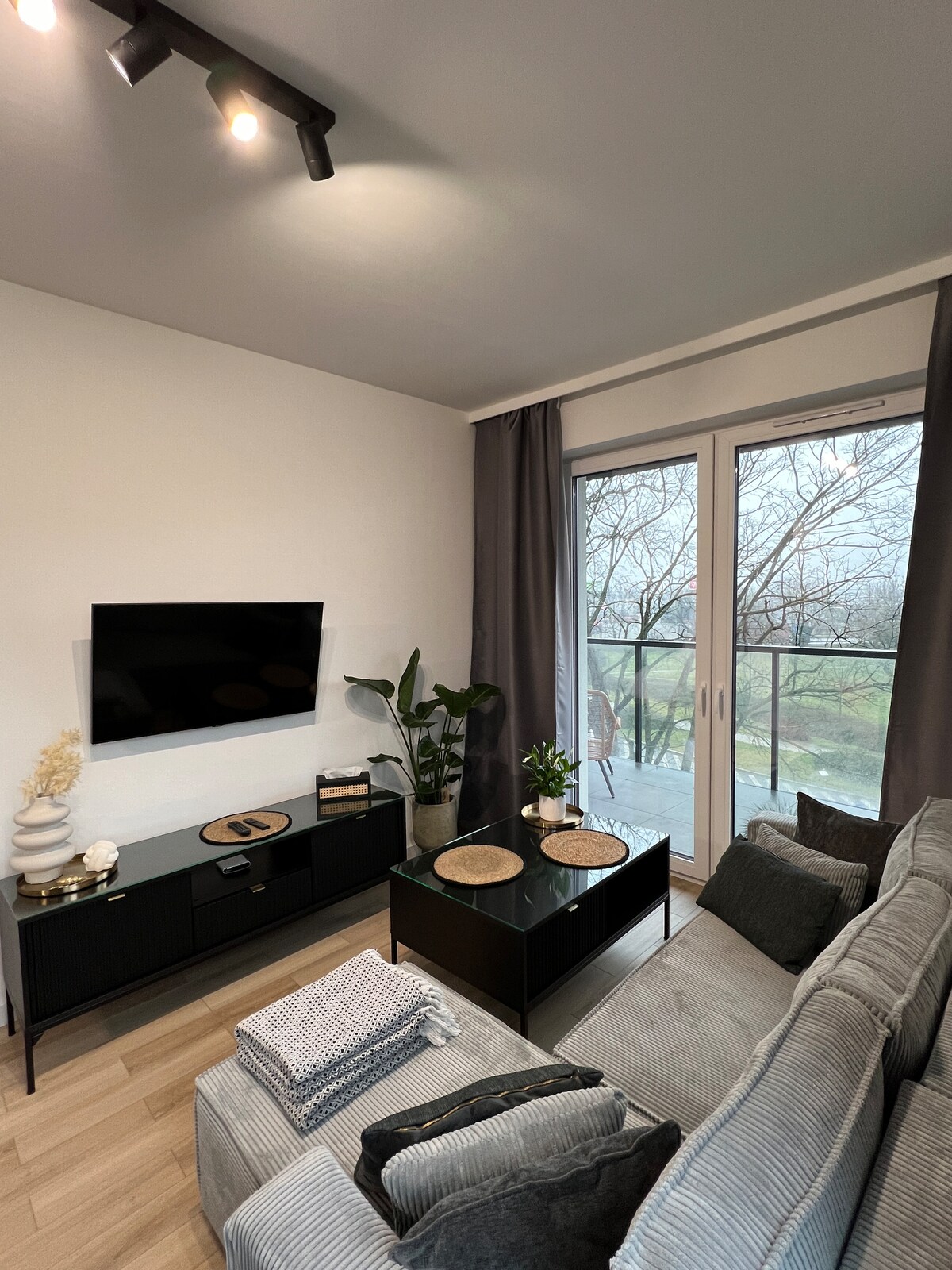 Modern apartment with private terrace and Jacuzzi (up to 40°C). 🫧 Perfect place for couples, for a city break or for remote work. * Private Jacuzzi * 30 m² terrace with sun loungers * Gym and sauna in the common area * 70" Smart TV and PS4 * Free parking in the underground garage * Full kitchen and fast Wi-Fi In a green area, near Czerniakowskie Lake, Zawady Beach, Morysin Reserve Note: - No pets, no smoking in the apartment and no parties.