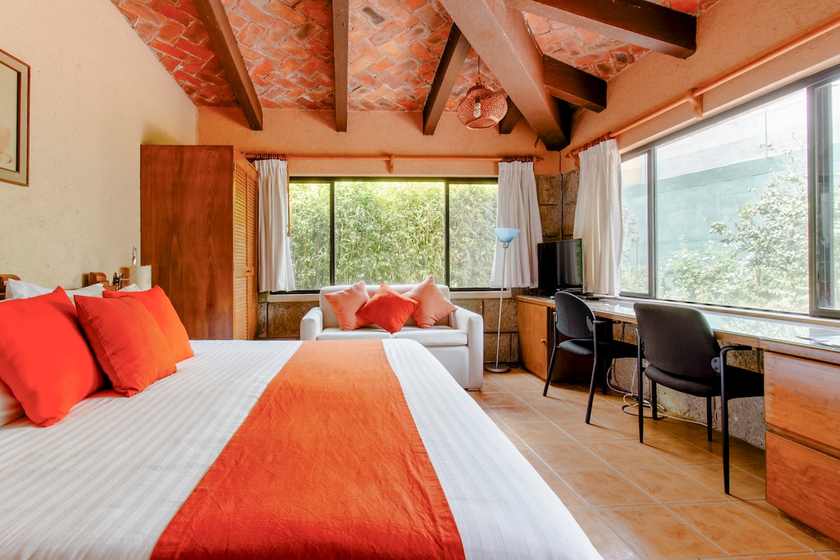 Beautiful suite for rent for one or two people in the wooded gardens of a house in Tequisquiapan, Qro. It has an equipped kitchenette, TV, Netflix and a good internet signal. Ideal for a relaxing weekend, working from home in a safe and peaceful place, or for retirees who want to enjoy the peace of nature. Located in the Los Sabinos subdivision, Tequisquiapan, Qro., a 15-minute walk to the Historic Center. We do not accept pets.