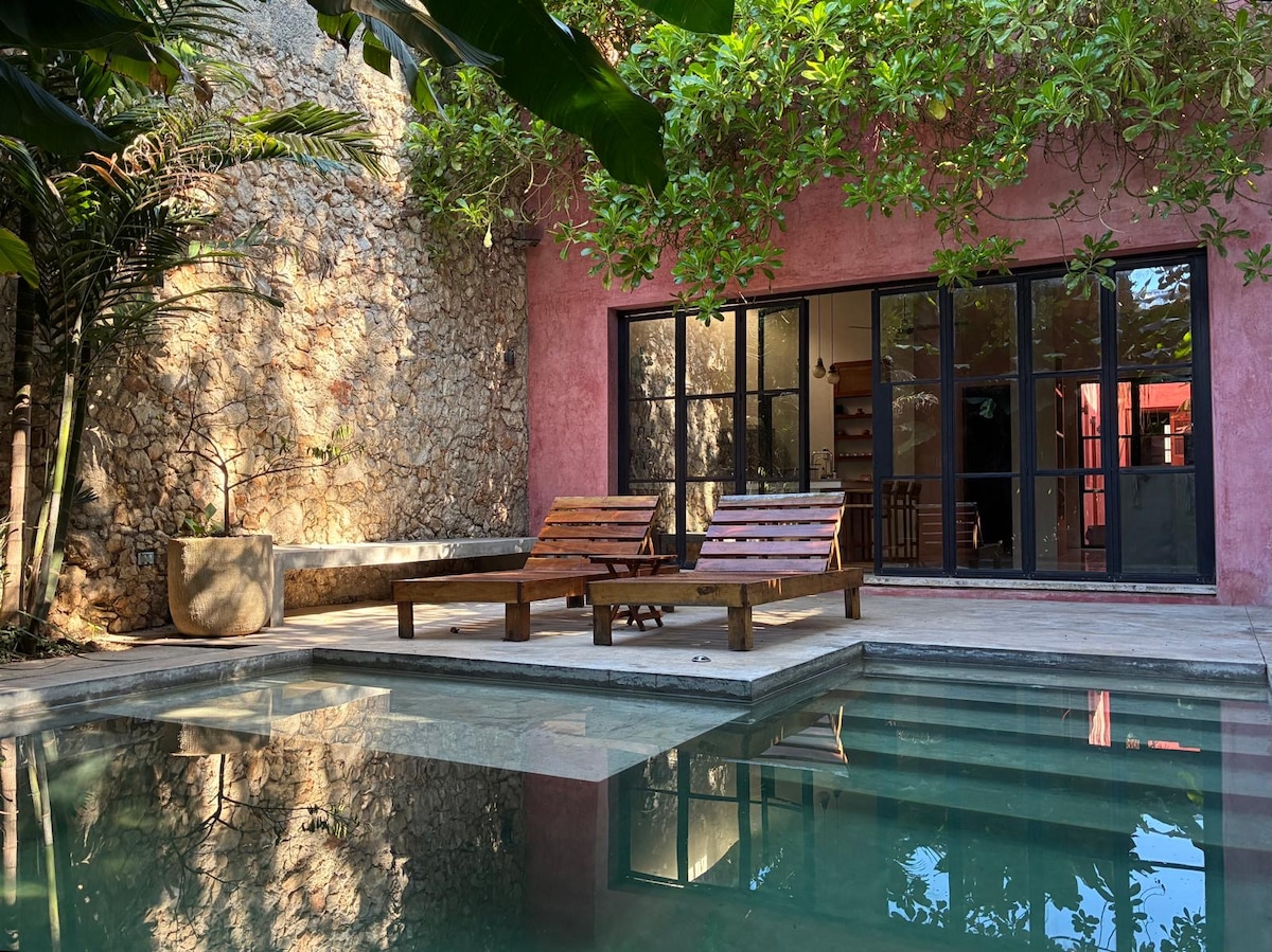 Spacious apartment inside colonial house, perfect for 2. Located east of downtown Mérida, near the ChemBech neighborhood, only a 20-minute walk from the main square. It welcomes travelers seeking calm and introspection. Unique in style and design, with luxury finishes, it guarantees privacy away from the hustle downtown. The apartment is completely private, on the lower level. It has a fully equipped kitchen and living room, a pool, a garden, a terrace, one king bedroom with a marble bathroom.