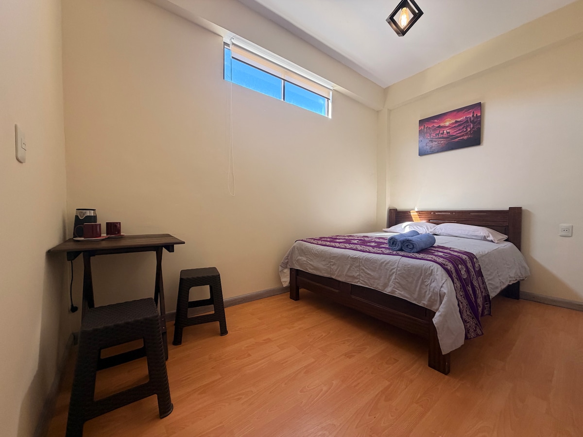 Cuarto privado y Alfombrado! Tendrás a tu disposición una habitación alfombrada y un baño solo para ti y tu pareja Habitación cerca al centro, pero lo suficientemente alejada para evitar ruidos de trafico y fiestas, a 10 minutos del las plazas turísticas y cerca de Agencias de tours hacia el Salar Vecindario Tranquilo y Seguro Cuentan con los servicios básicos Cerca de Tiendas y Comedores El cuarto cuenta con una cama de 2 Plazas, muy cómodo para que tengas un buen descanso🛏️