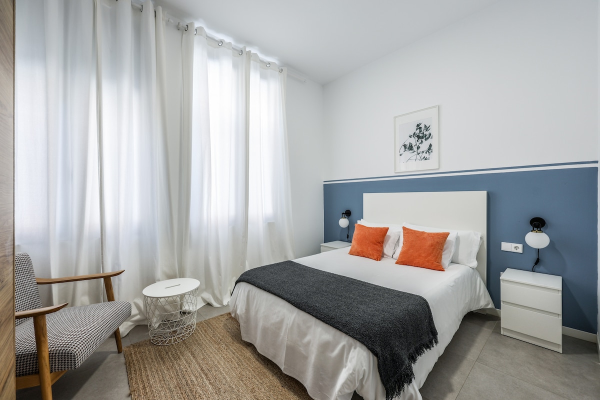 Luminoso dúplex para cuatro personas con acceso directo desde nuestro encantador patio. Cuenta con zona de estar con sofá, grandes ventanales que aportan luz natural y, en la parte superior, dos camas individuales que pueden unirse como cama de matrimonio. Cocina equipada con vitrocerámica, horno/microondas, nevera con congelador y cafetera Nespresso. Baño con secador, toallas y productos de higiene. Aire acondicionado e internet de alta velocidad. Cerca del mar y la Ciudad de las Artes.