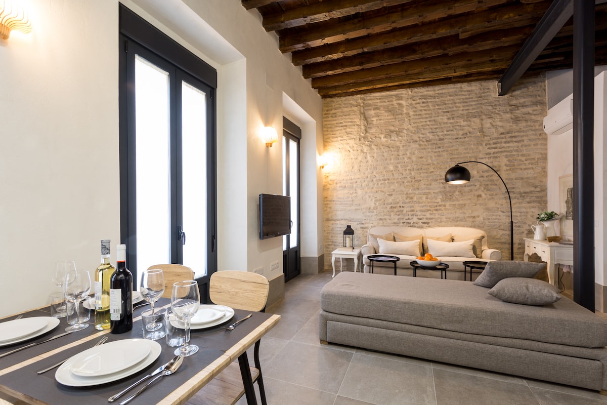 Beautifully restored townhouse converted into a modern vacation rental celebrates the old building structure with warm modern interiors and a touch of industrial style. Floor-to-ceiling, French windows look out over traditional balconies on to the charming street below. Sunlight floods the open plan space, casting light on exposed sandstone walls and illuminating the stunning oak beam ceilings. The shared top floor terrace offers incredible views to the Cathedral roof and the Giralda.