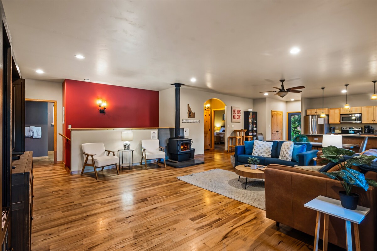This delightfully open and modern cabin provides all the comforts of home within easy walking distance of downtown McCall! You can prepare home-cooked meals in the beautiful kitchen, gather around the wood stove and watch movies on snowy winter days, and spend the summer on the spacious outdoor deck that overlooks the surrounding woodlands! You'll even have a basketball arcade game to provide hours of entertainment in the cozy family room, and a Tesla wall connector in the garage to charge at 72