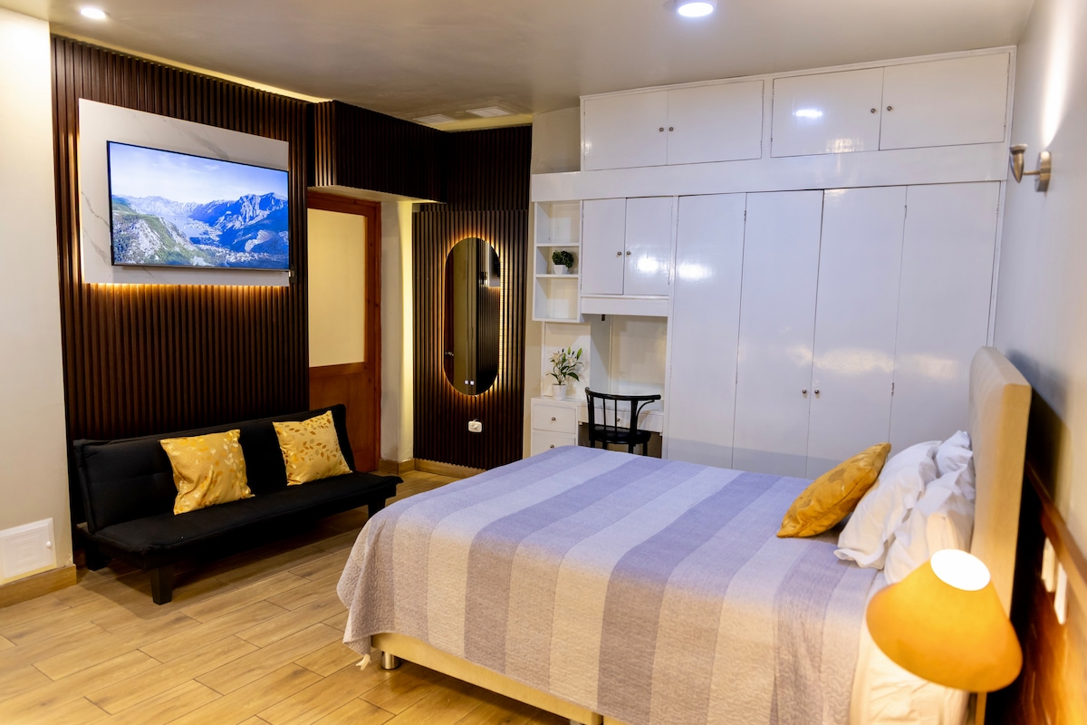 Experience comfort in our Standard One Bedroom Apartment, perfect for up to 2 adults and 1 child. The apartment features a luxurious king-size bed, full air conditioning, and a modern bathroom with hot and cold showers. Enjoy meals at the dining table for four or prepare your favorites in the full kitchen, equipped with a refrigerator, induction cooktop, oven, and all essential dishes and glasses. Ideal for a relaxing and convenient stay.
