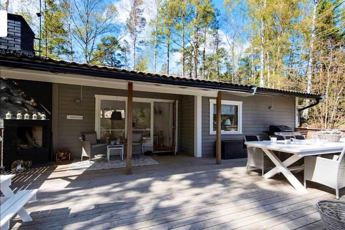 Find peace and adventure in this newly built wooden house about 1.5 hours from Stockholm City. The house breathes love for nature and is located on a quiet island in the Stockholm Archipelago, which mostly consists of nature reserves. There are no cars or noise, just wild berries and wild animals. Close to the sea, your own jetty (see picture) is about 100 meters from the house. Access to wood-burning stove, wood-fired sauna, 2 Sea Kayaks (K1) and 2 Mountain Bikes (All included in the rental).