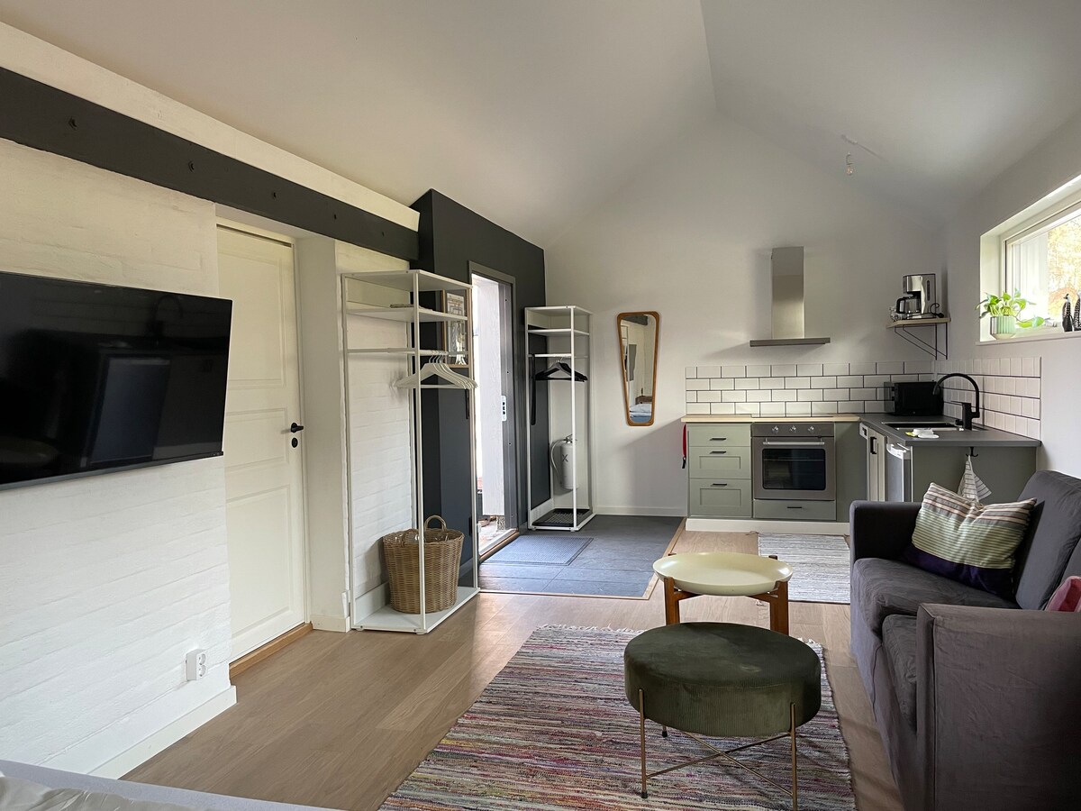 Farmhouse on horse farm with large parking area for truck/trailer 💥 #LYCKANSLODGE. Bedroom with bed 140 x 200 cm, living room/kitchen with dining/work table and EXTRA BED possible. WASHING MACHINE comb dryer, bathroom with shower & toilet. Terrace with dining area and lounge group in summer. FREE FAST WiFi. Easy self check-in/out. Easily accessible RURAL location 3 km from exit E6 and train station. HORSE STALLS are available to rent for training competitions, pastures, paddock.