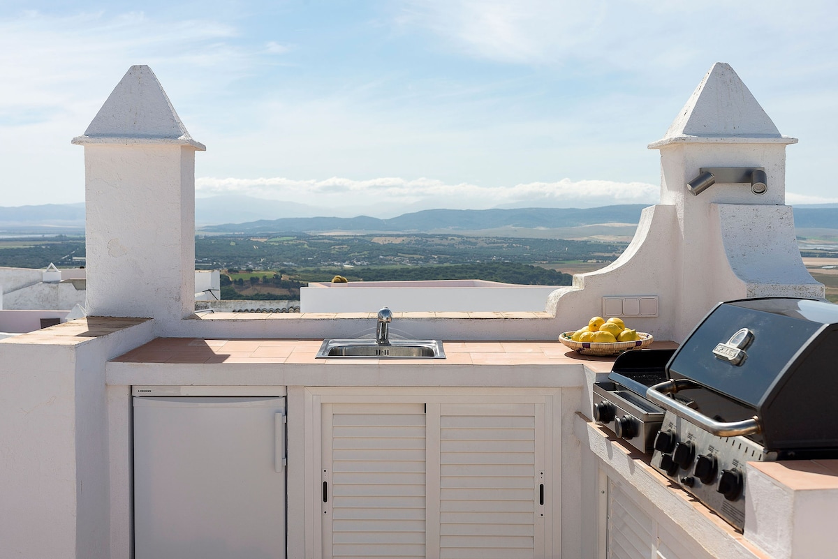 A small house with beautiful views, with a bedroom on a wooden mezzanine and another sofa bed in the living room. The bathtub is in a cave with a large shower. A fully equipped kitchen including a dishwasher. Oak flooring. Air conditioning. Fiber Wi-Fi. There is a parking lot just below, something very important in the summer months, and you are a two-minute walk from the center of Vejer's old town. A very quiet and charming area. Fiber Wi-Fi. Air conditioning. Barbecue and private terrace.