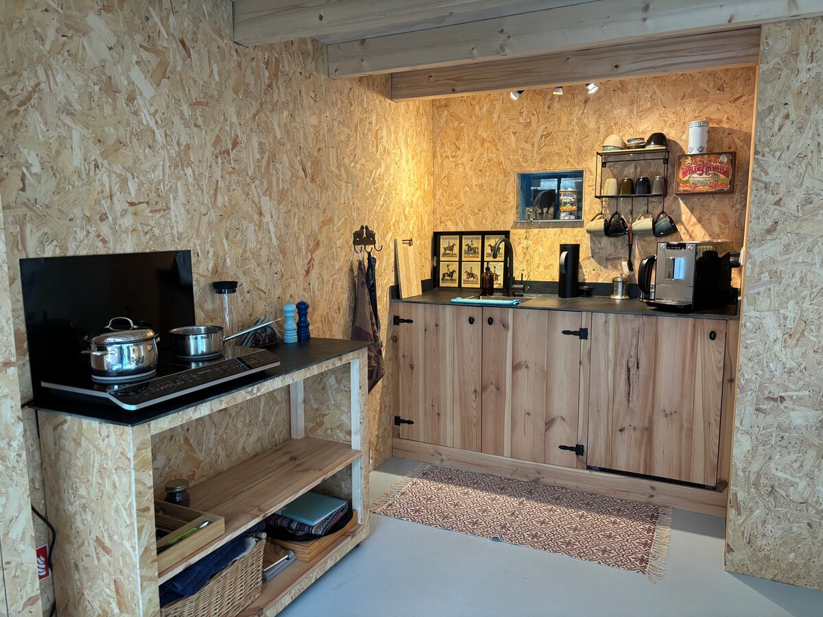 Relax and unwind in this cozy, charming space. From our cosy spot in the Achterhoek (over 40 m²), you can enjoy a view of the natural surroundings, including the forest and two piglets. You can hear and see a lot of birds all day. You sleep on a cozy loft, where you can come with a sturdy staircase. Other: You have your own entrance, a work/study area (adjustable), and your own small garden with a terrace (including BBQ). Includes books and games. Listen to music, via Bluetooth or LP player, and look around you...