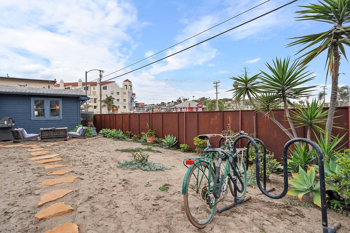 Enjoy a stylish, fully equipped authentic experience at this centrally-located Venice original craftsman bungalow, 2 blocks from the ocean. Amenities include: washer, dryer, dishwasher, retro style fridge, microwave, 2 desks, living area, memory foam queen bed, heat/AC, and tub/shower combo. Outdoor features include pergola, kitchen bar/service/work area window, outdoor dining area, outdoor lounge area with fire pit, outdoor projector screen, heater, BBQ, large sand yard, and bike rack.
