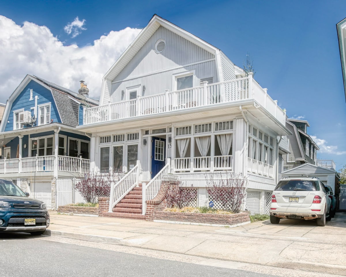 Luxurious beach house steps from the boardwalk and beach. 20-min walk along Atlantic City boardwalk to Tropicana Casino. 9 bedrooms, 4.5 baths, sleeps 25. Open porch with ocean view, rear deck with top-of-the-line natural gas grill. Spacious kitchen, dining, and living areas. Private gazebo houses fully sanitized Jacuzzi hot tub for 6! Free level 2 EV charging! Perfect for families or groups seeking a memorable coastal getaway. Book now for the ultimate blend of luxury, style, and convenience.