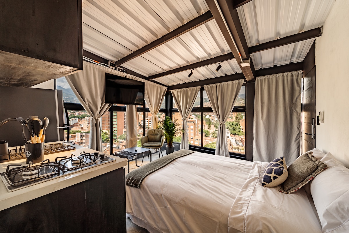 A breath of fresh air in the middle of the city Calm view, real silence and soft light: an atmosphere that invites you to slow down. Enjoy Medellín from a loft created for rest and relaxation. Whether your stay is short or long, this space adapts It has soundproofing, air conditioning, a queen size bed, a fully equipped kitchen, a private bathroom, a desk, WiFi and a TV with streaming. 24-hour surveillance Metro station a few minutes walk, close to Laureles and with easy connection to the main tracks