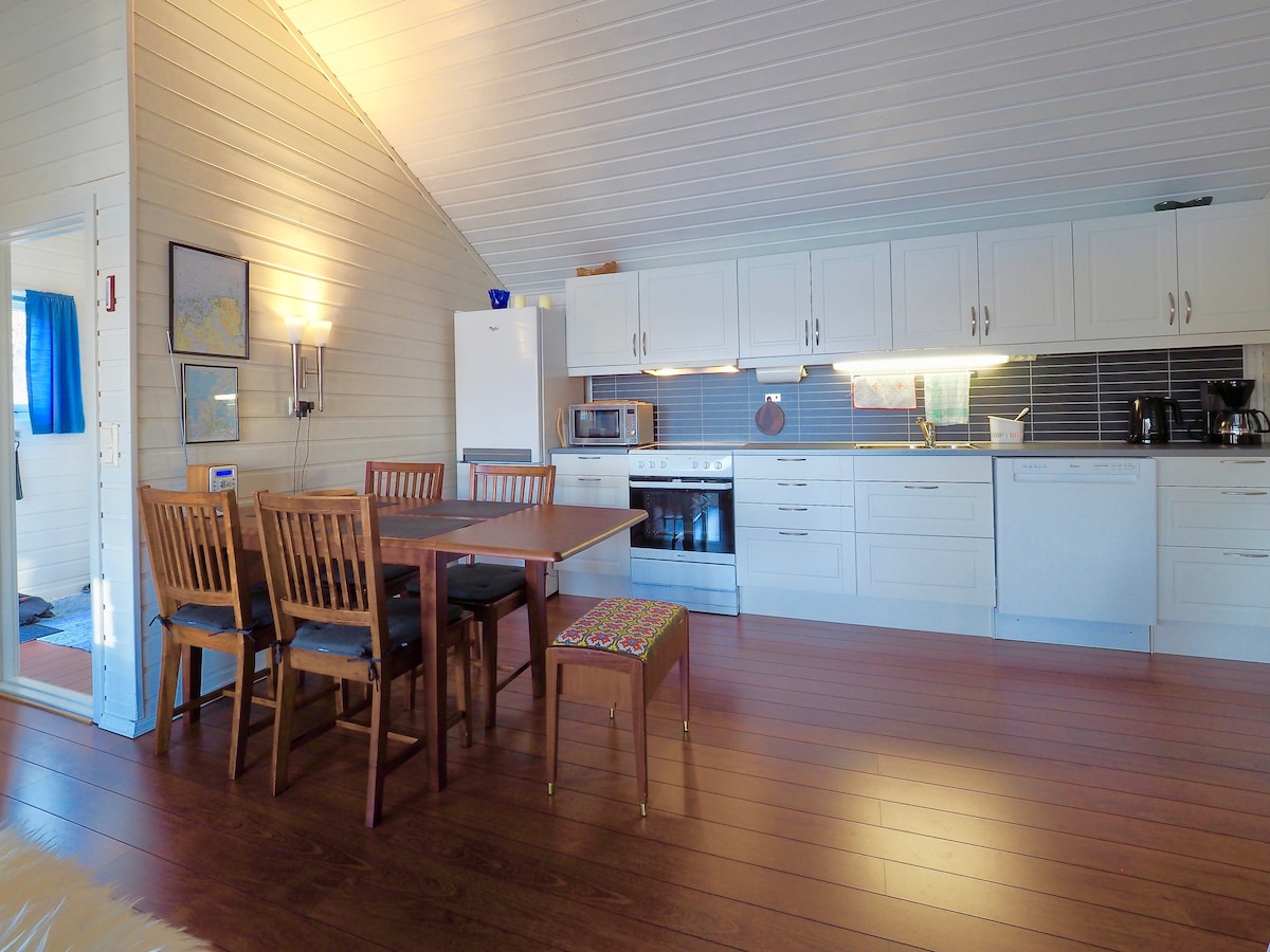 Ten minutes from Leknes city centre, almost at the end of the road where no other cars normally drives, just so incredibly beautiful and silent. This cabin, with its cozy atmosphere and extremely nice view has all you need for a relaxing stay. There is two bedrooms, one with a double bed and one with a bunk bed. A nice cozy living room with a kitchenette with dishwasher and all things you need.