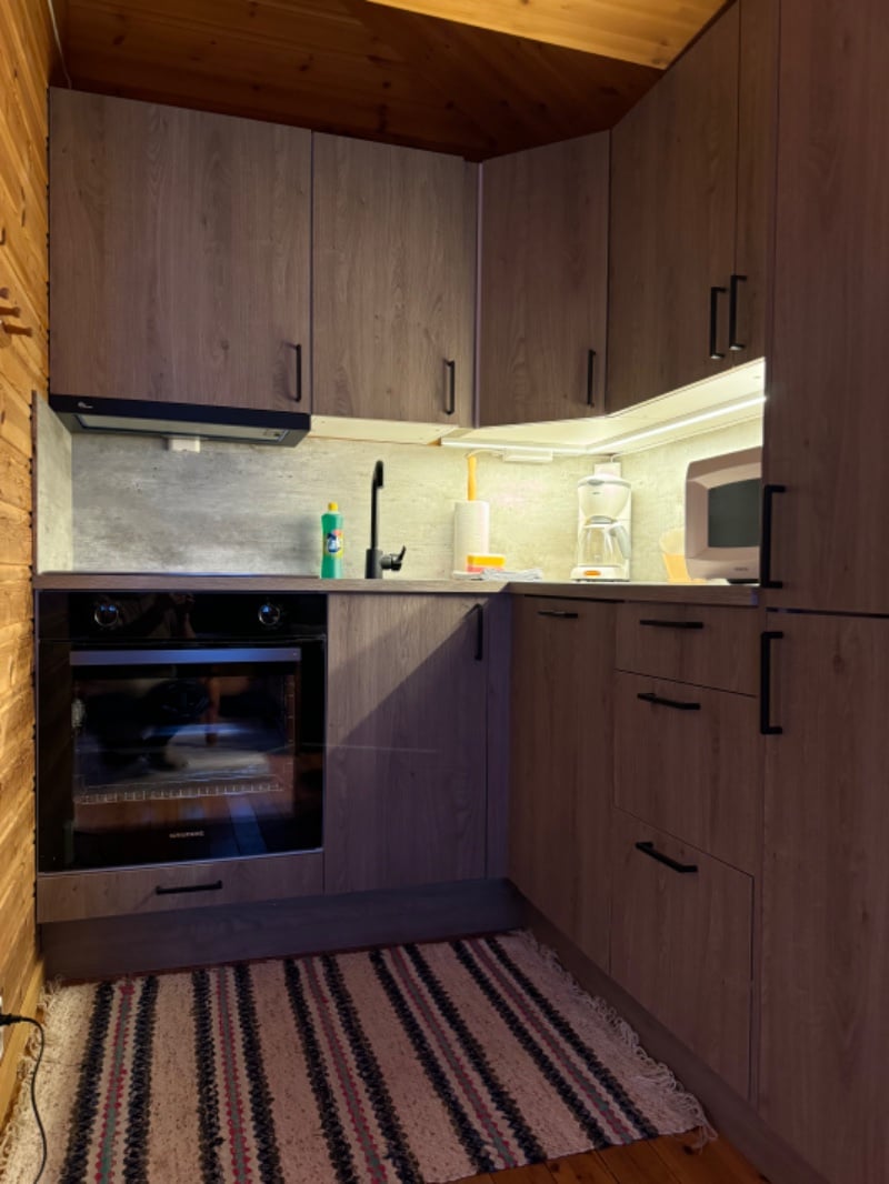 The cabin is approximately 70 square meters, and contains a new renovated part that was completed in the summer of 2022. The new part contains a new spacious bathroom, a large hallway with wardrobes and hangers for clothes and shoes, and a bedroom with a double bed. The bathroom contains a sink, vanity unit, shower and toilet and washing machine. The cabin otherwise has an open living room and kitchen area, as well as two bedrooms and a storage room/laundry room with sink and fridge/freezer.
