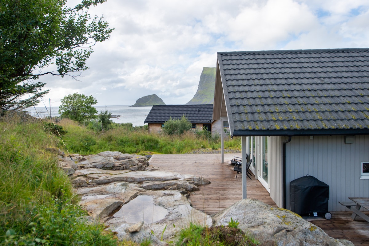 Eksklusivt sjøhus i Lofoten –Sjøutsikt, nordlys og midnattsol. Velkommen til vårt moderne hus ved sjøen på Ramberg, Lofoten. Her får du spektakulær utsikt, nordlys om vinteren og midnattsol om sommeren. Huset har høy standard, gode senger, romslig kjøkken og stor uteplass. Etter turen eller surfingen kan du nyte badstu med vill havutsikt. Perfekt beliggenhet for naturopplevelser, fjellturer og strender. Opplev Lofoten fra første rad!