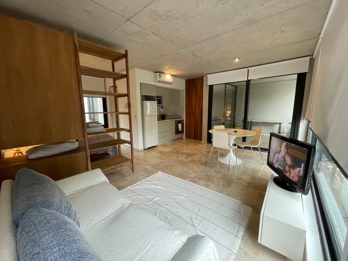 Welcome to our gorgeous studio apartment in Palermo Hollywood, nearby the Campo Argentino de Polo King-size bed | Smart TV 42' + Netflix | Safe Deposit Box | AC Undercounter refrigerator | Microwave | Toaster | Nespresso | Electric Kettle | Electric stovetop Wi-Fi | Smart lock | Security 24/7 Best-quality towels, sheets, and blankets Important: -check-in starts at 1 pm -check-out up to 11 am We can hold bags before the check-in and after the check-out in our office at the building for free