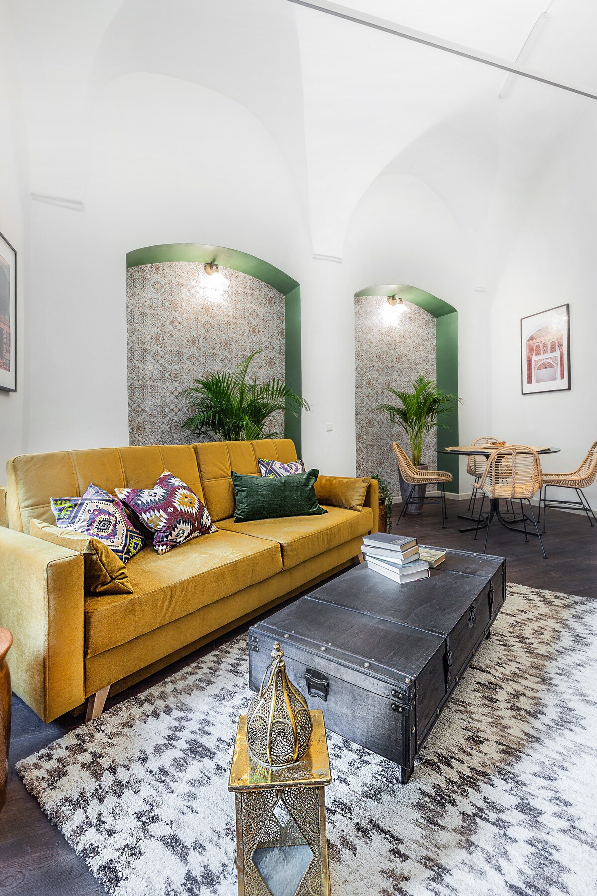 This carefully crafted apartment is tucked away in a sleepy courtyard in the middle of bohemian Užupis, perched on a hill and separated from the Old Town by a river which wraps around its edges like the tail of a stray cat. This sumptuous ground floor flat is every bit as eclectic as its surroundings, designed in a bespoke Arabesque style and overflowing with textures, colours and details. It is perfectly suited for those who would wander its crooked streets and bewitching back alleys.