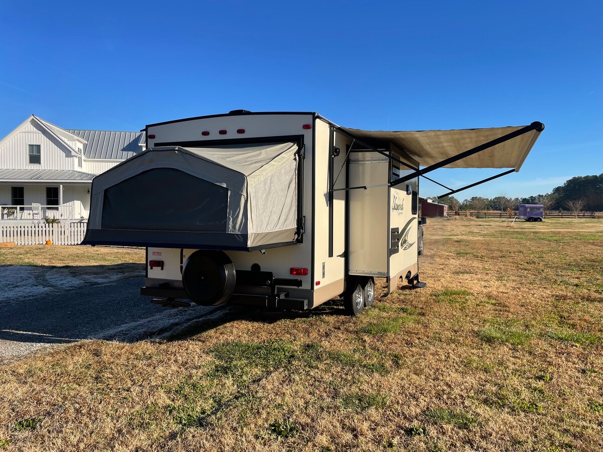 Here’s my baby a spacious 23’ camper hybrid with two queen pop outs, a convertible sleeper dinette, convertible couch, 2 SLIDE OUTS make for a spacious living space. Includes a TV, DVD, Bluetooth capable radio with indoor/outdoor speakers, linens provided. It weighs 5,045lbs dry. No smoking. Camper is NOT ON A SITE you will have to book your site. This thing has allowed us to create memories at an affordable rate, we’d love to host you!