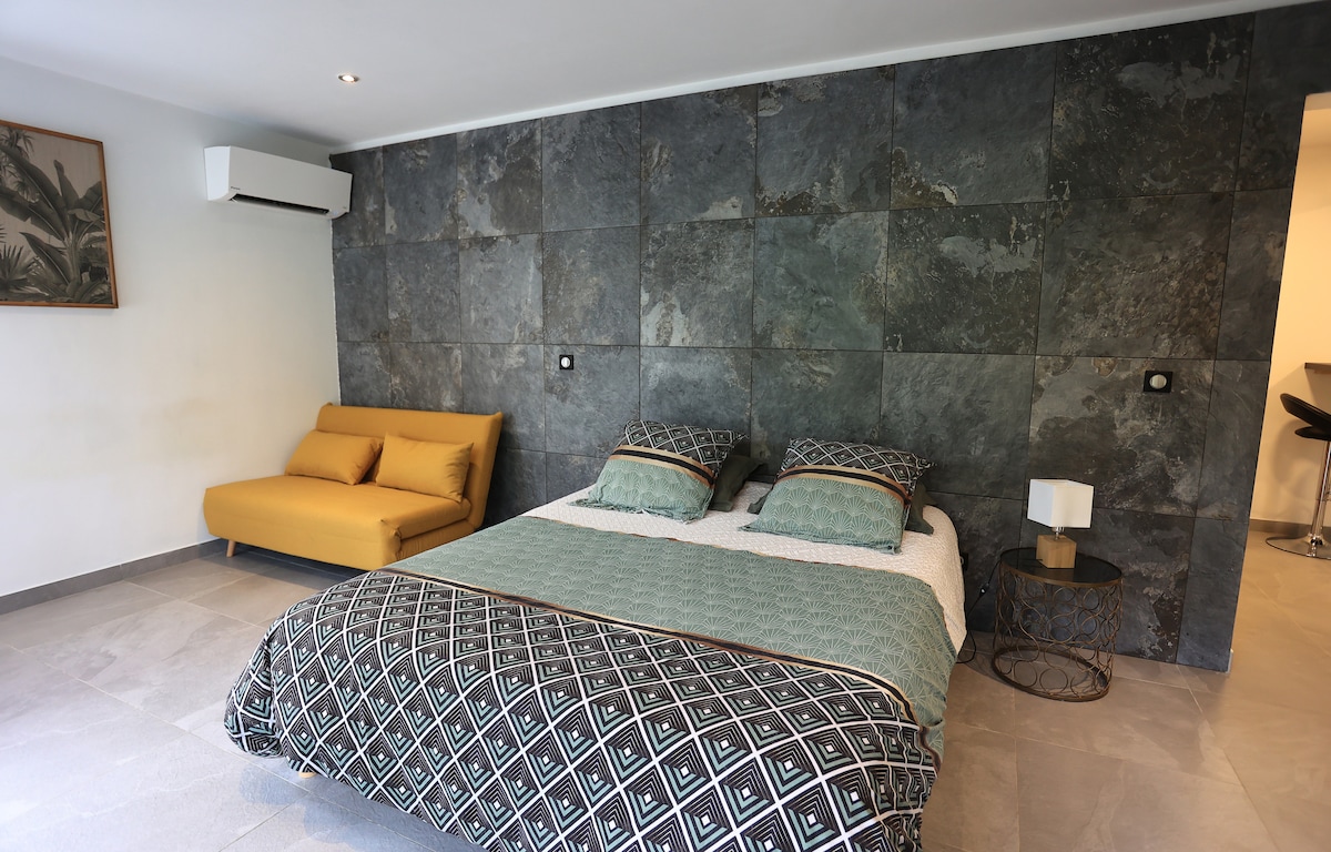 Grande chambre dotée d’un cabinet de toilettes fermé, d’une salle de douche et d’une kitchenette (réfrigérateur, micro-ondes, machine à café, bouilloire, grille pain…) Décoration chic et contemporaine. Terrasse et jardin. Logement calme et élégant.