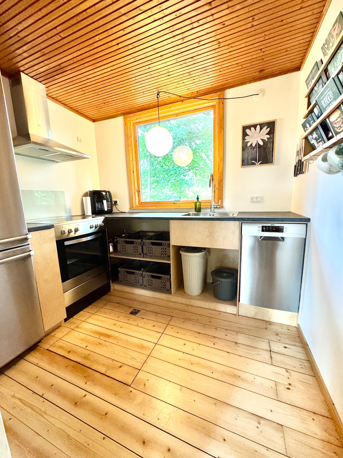 There is plenty of room for a family of 4 in this detached 80 m2 home. The home contains a combined living room and sleeping area. Private bathroom and toilet, as well as a small kitchen with the possibility of light cooking. Outdoor dining area, barbecue, and fireplace overlooking Mariager Fjord. Large garden with the possibility of playing ball games. Neighbor to Mariagerfjord golf course, Denmark's most beautiful golf course. And Revsbæk Put and Take fishing lake. Bike trail outside the garden gate. Rich opportunity to explore the amazing nature of the Fjord