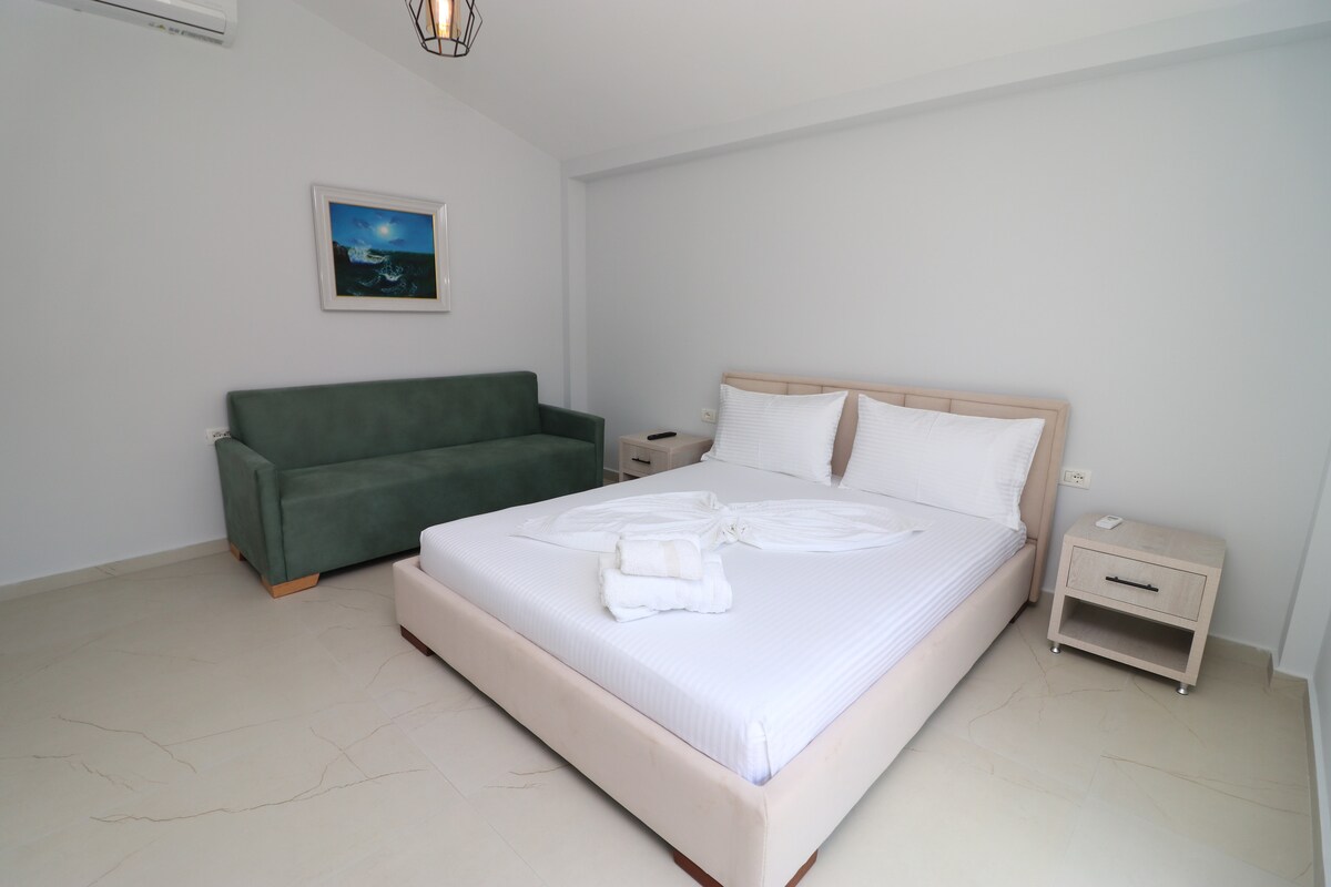 A charming and stylish top floor apartment with breathtaking views - the panorama of Karaburun over the bay and captivating Llogara view at entry. Enjoy the utmost comfort and privacy with a queen bed adorned with Greek thick cotton sheets and a delightful canopy. The living room features two single beds, perfect for lounging or sleeping, designer furniture, the beauty of both sunrise and sunset, and a gentle wake-up call of chirping birds. Your unforgettable stay awaits in this retreat.