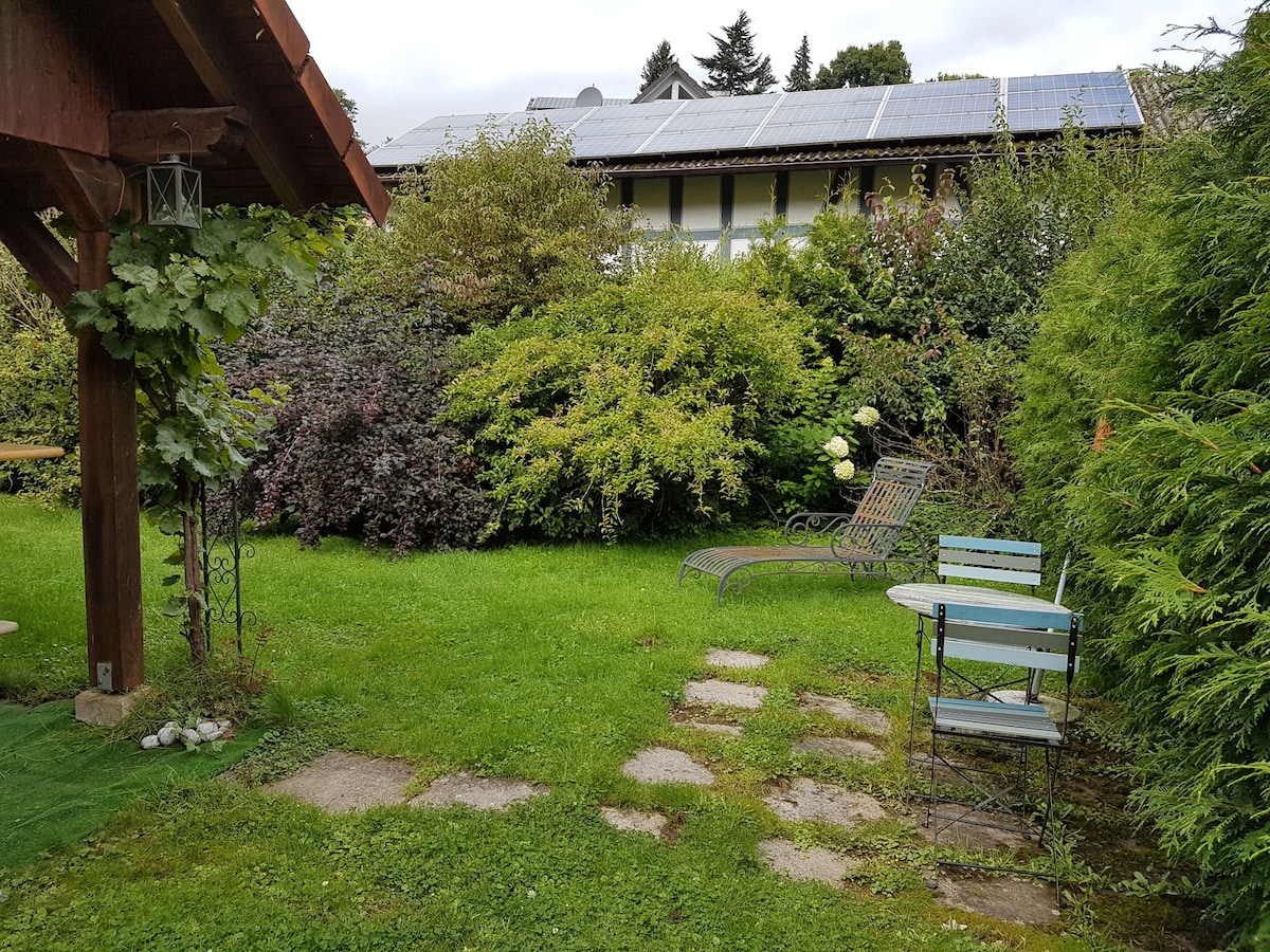 The little black! A charming cottage on the Musenberg. A beautiful colorful farm garden welcomes the guests. The covered patio invites you to enjoy outside. For grilling and cooking, use the outdoor oven. (spring to autumn) The bright house, built into the roof, is furnished with a lot of love. Experience relaxing days surrounded by nature! Hiking and cross-country skiing right outside the door. Pets are welcome upon request. Maximum 1 dog.