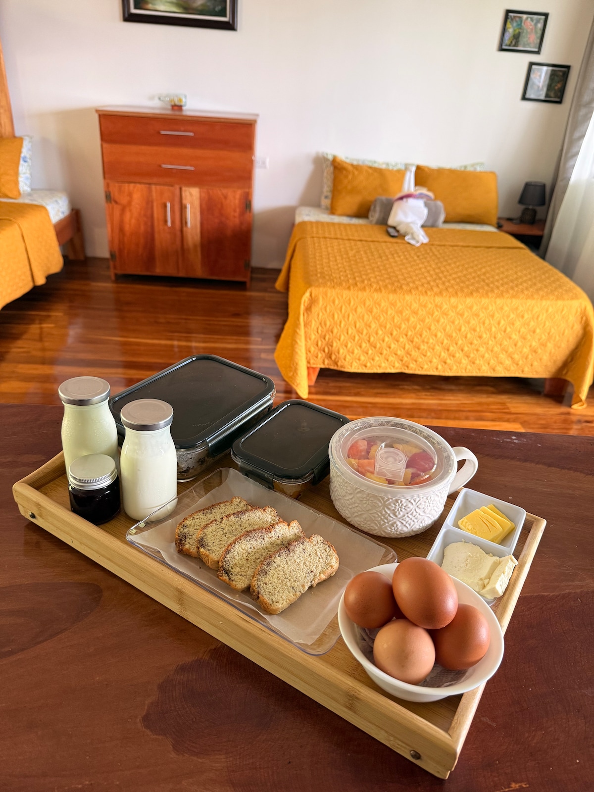 Take it easy at this unique and tranquil getaway/hobby farm nestled on a ridge with amazing valley views, stroll down our trail to your private swimming hole in the magical waters of Rio Celeste…the Blue River. National Park is walking distance, Bird watching, hiking trails, magical views of 3 volcanoes on a clear day, horseback riding, restaurants close by, many tours and activities to enjoy If you are looking for something bigger. We have a 2 bedroom on the same property. Tenorios Treasure 2.