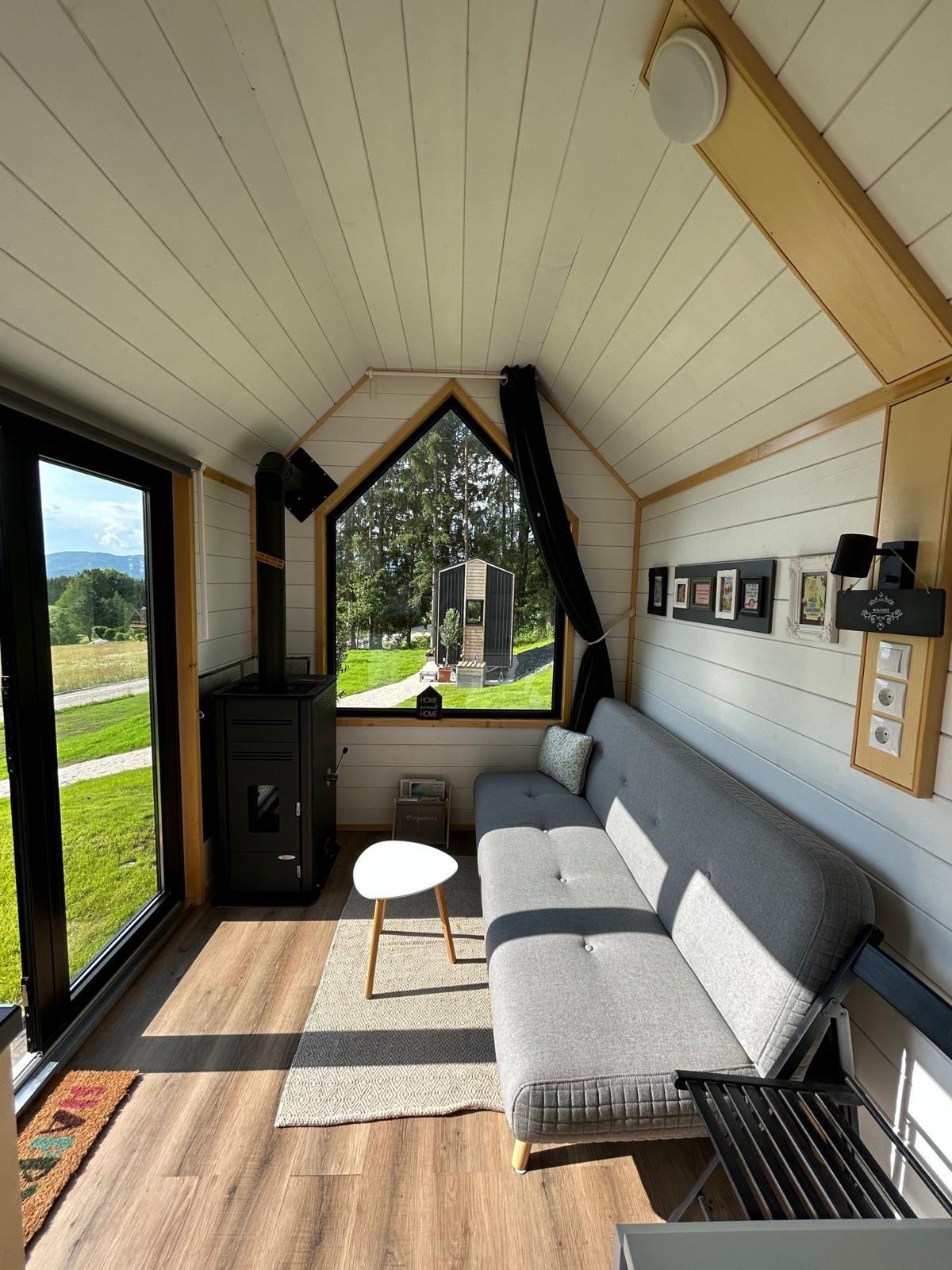 Snuggle into our lovingly designed tiny house, which is permeated by warm wood and soft colors. Enjoy the romantic atmosphere as you experience breathtaking views of the surrounding nature, majestic mountains and mysterious forests through the panoramic windows. Relax in your own year-round hot tub and marvel at the starry sky. Book now to lose yourself in this oasis and enjoy the sight of nature.