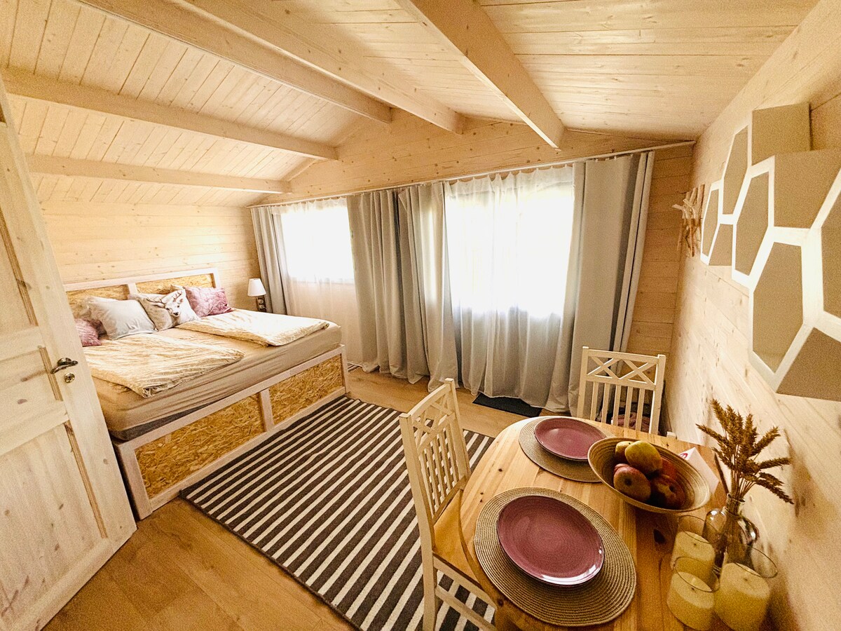Puuküttega saunamaja kamina ja eesruumiga, kus on ööbimiseks 2-inimese lahtikäiv diivanvoodi (155x190cm). Sobib paarile, kes naudib privaatsust looduses ja omaette terrassi männipuu all. Majutus on 100% iseteenindusega. Sauna kütmiseks kulub ca 1-1,5h. Saunarätid, käterätid, voodilinad ja joogivesi tuleb kaasa võtta. Tekid ja padjad olemas (50x60cm). Pesemiseks on dušš ja saab nautida tiigis suplust.