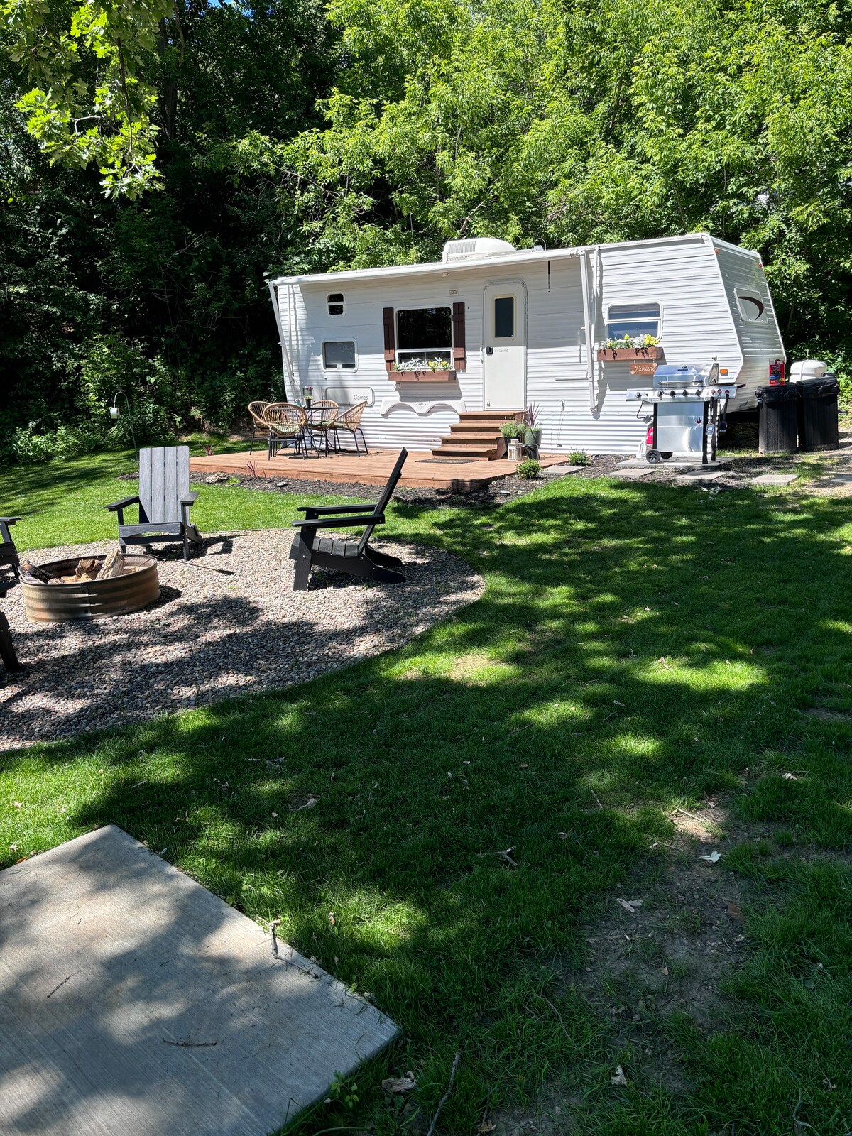 Get outdoors and reconnect with nature at this unforgettable escape 20 minutes from Rochester! Enjoy s'mores by the campfire, lakeside swimming, and spending quality time with the people you love. This RV offers three beds - one queen, one full, and one twin, one bathroom with a shower/tub, and a full kitchen. A TV that offers streaming services and WIFI. Outdoor games, paddle boards, and more! Additional offerings include ice and firewood.