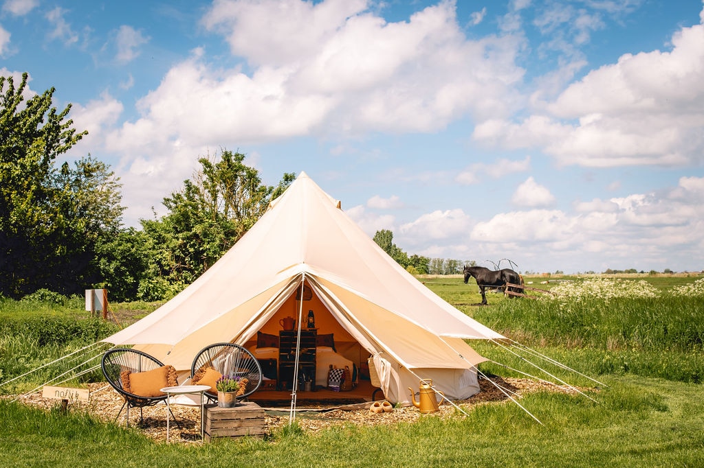 NEW LOCATION! This charming Lotus Belle tent is located on a private island, right in the heart of a peatland area. An intimate place where you can truly unwind together and fully experience island life on the water. The tent is set on a 500 m² private island. No other tents; only a small house further along. Including private toilet, a hot-water shower, and 220V electricity. A pedal boat allows you to head out onto the water together and explore this beautiful area at your own pace.