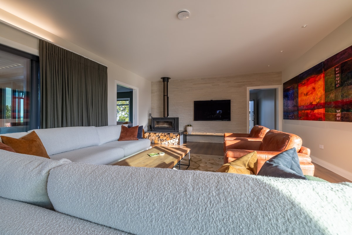 Breathe the fresh country air at this contemporary architecture retreat. On the outside, the home features a sleek industrial aesthetic and a private outdoor bath, while the inside bursts with a boutique design style, neutral greys, and wood accents. The country stay is located down a typical New Zealand country road. Surrounded by dairy farms and kiwi fruit orchards, guests may see farmers about their daily work. Feel free to wave out to them if they drive past in their tractors.