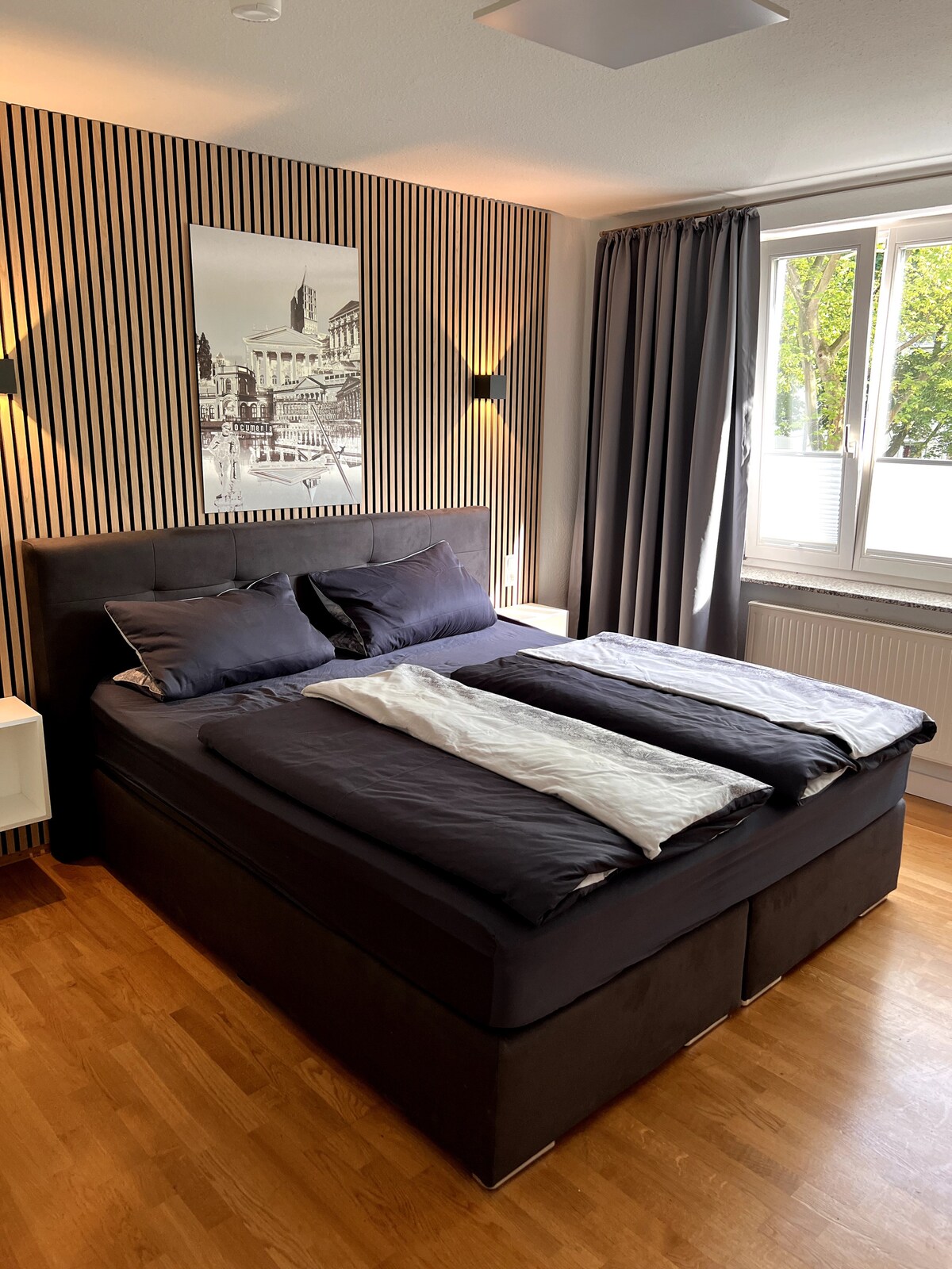 Modern, newly renovated 80 sqm apartment with balcony and unique views: The apartment is in the Marbach district. The city center is a 15-minute walk. It is located right on the edge of the forest and invites you to relax after a visit to the historic, lively Oberstadt. The apartment is fully equipped with high-quality and modern amenities (not barrier-free). It has one bedroom, one bathroom, a storage room and an open living-dining area with large window front.