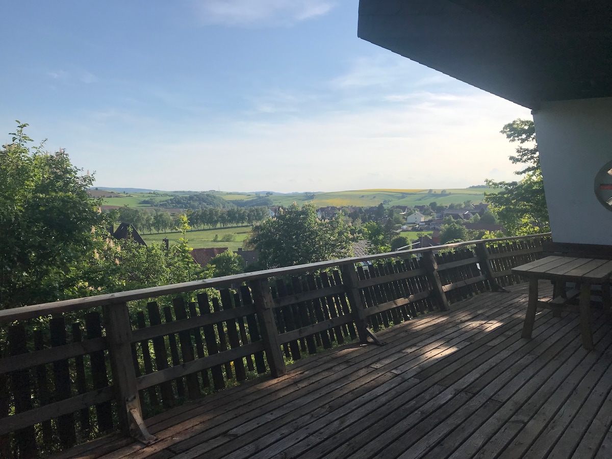 Our small cozy cottage is located on the outskirts of the village with a distant view far into the Kellerwald National Park. The detached cottage can be reached by a small enchanted path - or you can drive comfortably up the mountain behind the house, park directly on the associated parking space and go down a wide staircase to the house. The cottage has a living-dining room, a bedroom and a bright bathroom as well as a large protected terrace.
