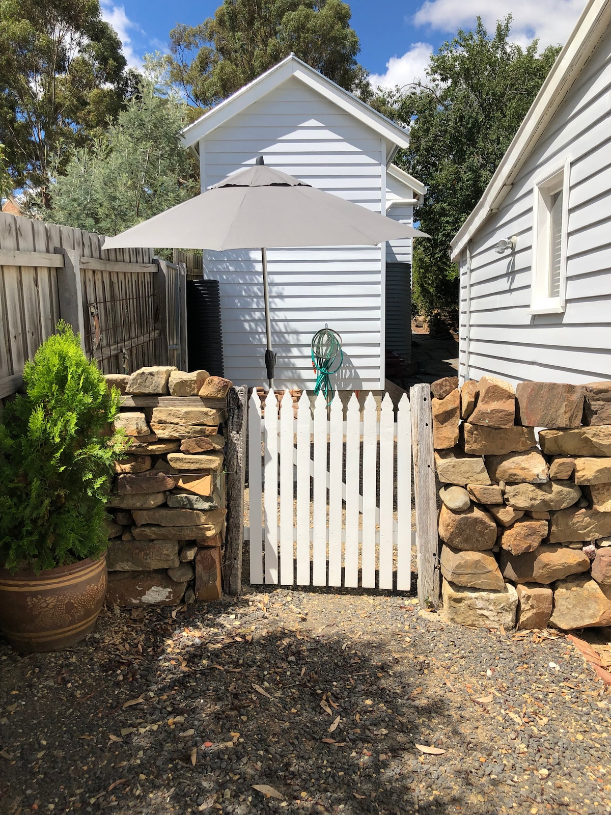 An historic free-standing building on our 12 acre property "Claremont" (c.1857), the Garden Cottage has been fully renovated to offer a unique place to stay in beautiful, peaceful and historic surroundings. The accommodation is totally private, with a queen bed, en suite bathroom and basic food preparation facilities (fridge, microwave, toaster and kettle). It has a split system for heating and cooling. The Garden Cottage is approx. 3.4 km to the heart of Castlemaine township, and is only a short walk to the lovely Botanical Gardens.