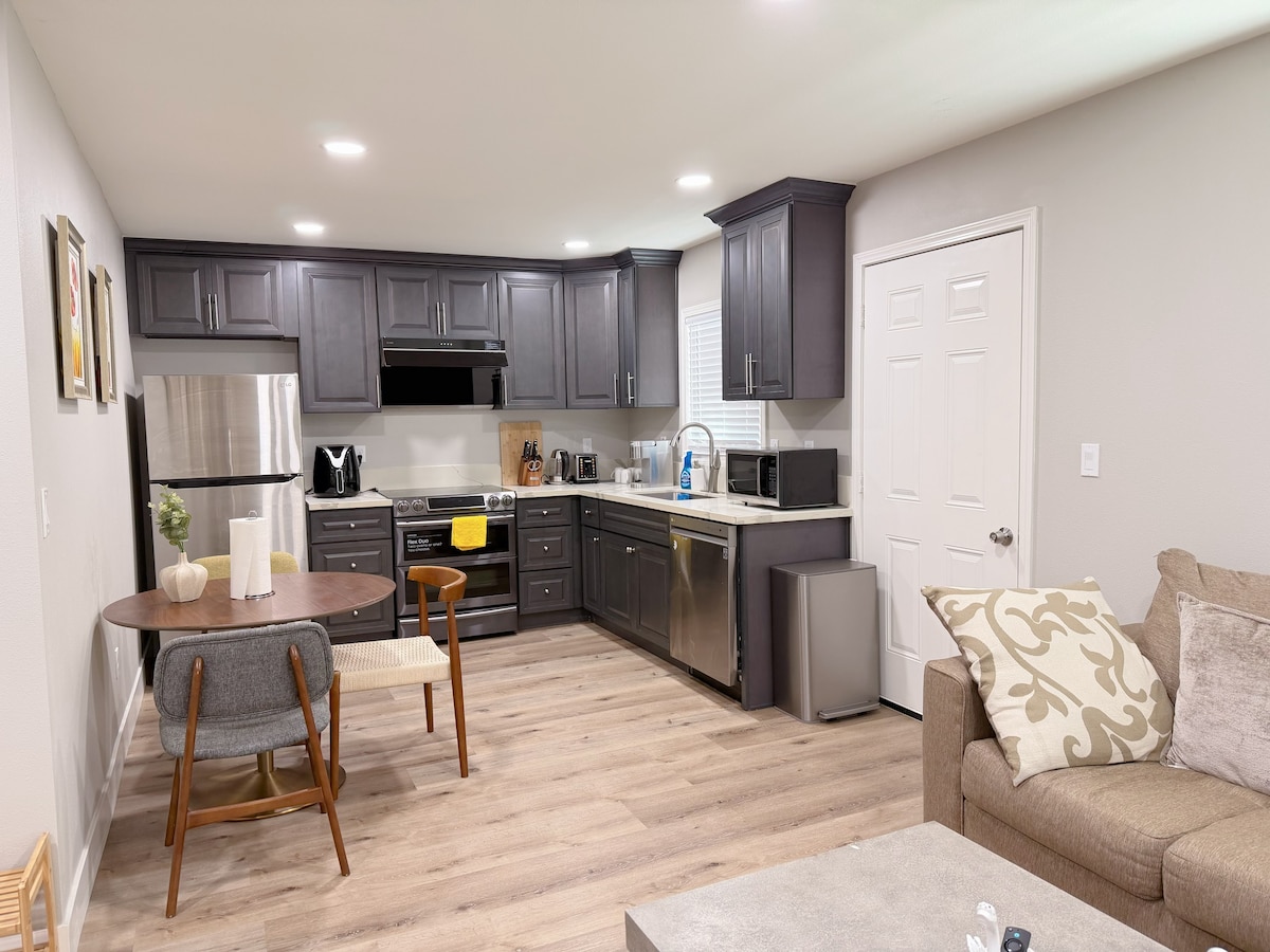 This modern suite is warm and inviting, featuring soft color tones that create a tranquil atmosphere. The kitchen includes a contemporary dining table and chairs, perfect for business travelers, and the layout offers a spacious feel. A comfortable large bed with a blanket provides a relaxing space for restful nights. Ideal for those seeking a high quality of modern living. Shared washer and dryer are available outdoors for guest use. A comfortable and relaxing space for your stay.
