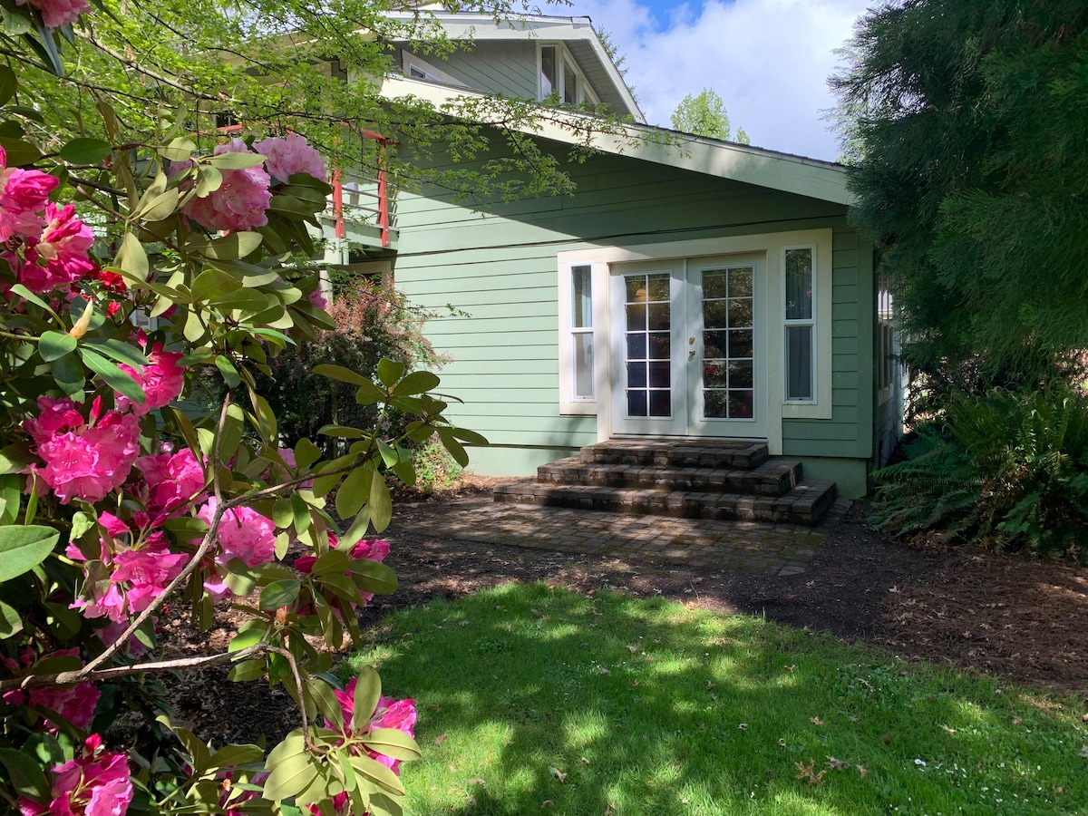 Charming 250 sq. ft. South Eugene bungalow guest loft with private exterior entrance (10 steps up), ideal for 1 guest. Full private bathroom with sink, toilet and shower.* Queen-size cabinet bed with comfortable memory foam mattress, bamboo cover, quality linens. *Though bathroom ceiling height is 7’6” at highest level, please note that angled ceilings in shower may provide less-than-ideal head space for guests on the tall side. Shower head is removable/hand-held for added convenience.