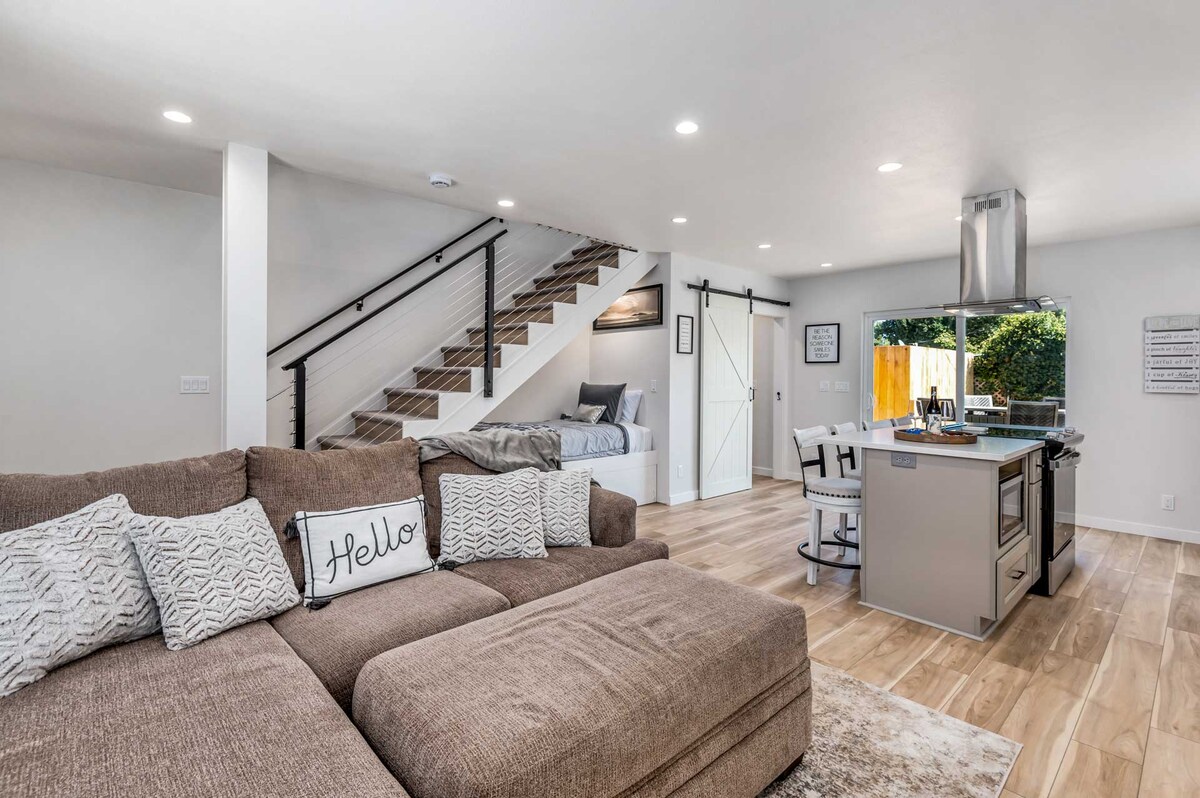 "THE SHED", a private, attached STUDIO with barn-like accents. There's a Kureg coffee machine, MINIMAL kitchenette equipped with dishes, sink, microwave and small fridge (NO cooktop or stove), LARGE KING BED with individual cotton duvet covers lofted over a cool, memory foam mattress. Great high speed WIFI, a 42-inch flat screen TV with LOCAL channels ONLY or you may access your Apple TV account. The back deck overlooks our beautifully landscaped backyard and quaint chicken coup.